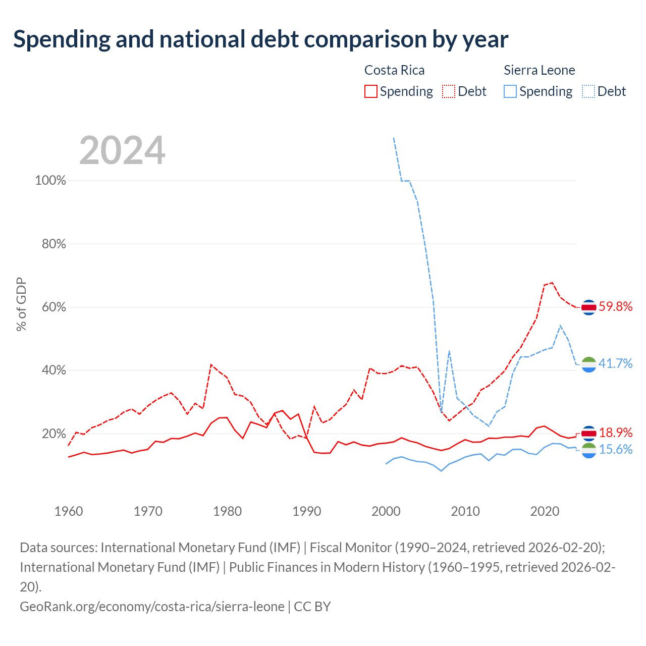 Costa Rica has $57B in government debt (59.8% of GDP), compared to $2.91B (41.7% of GDP) in Sierra Leone.