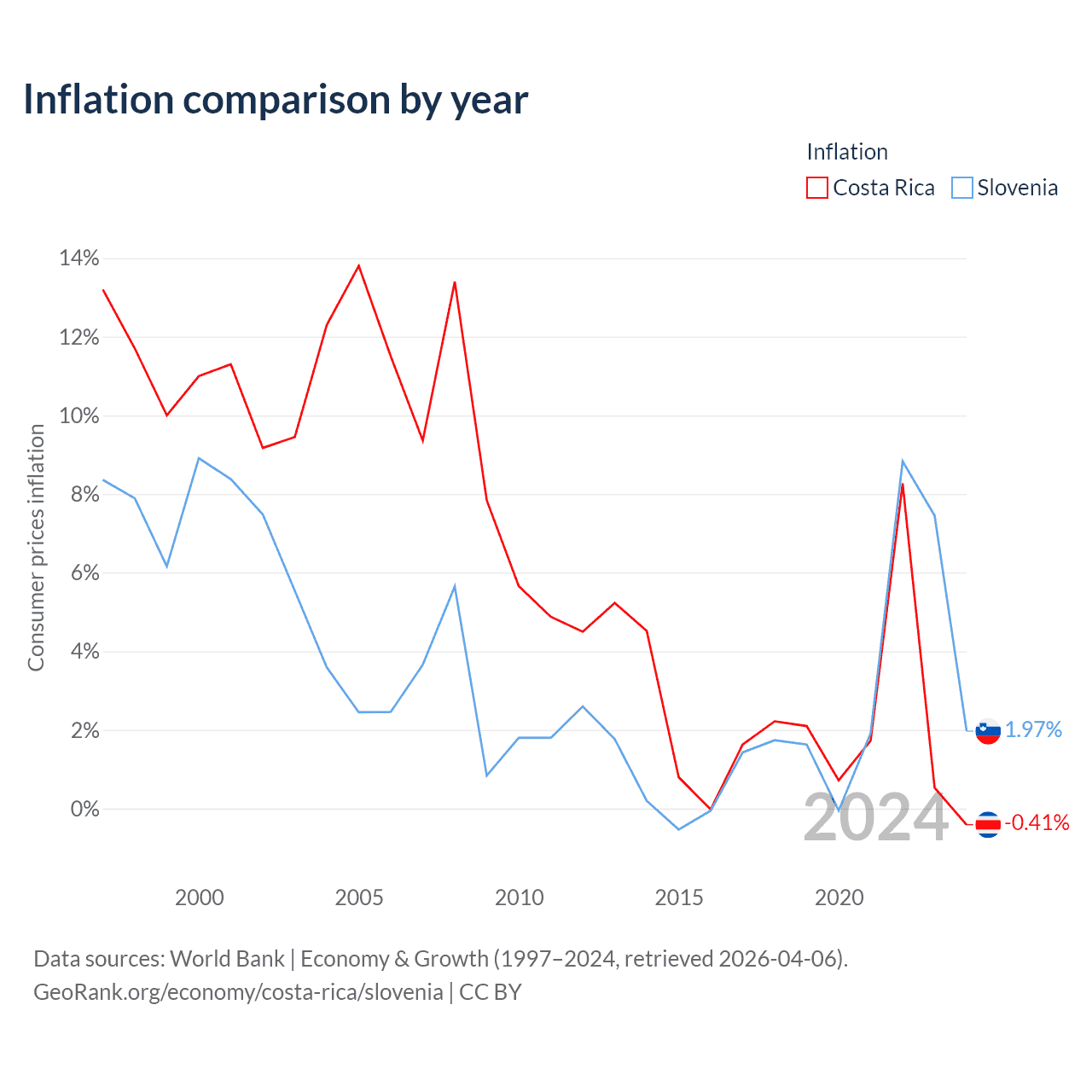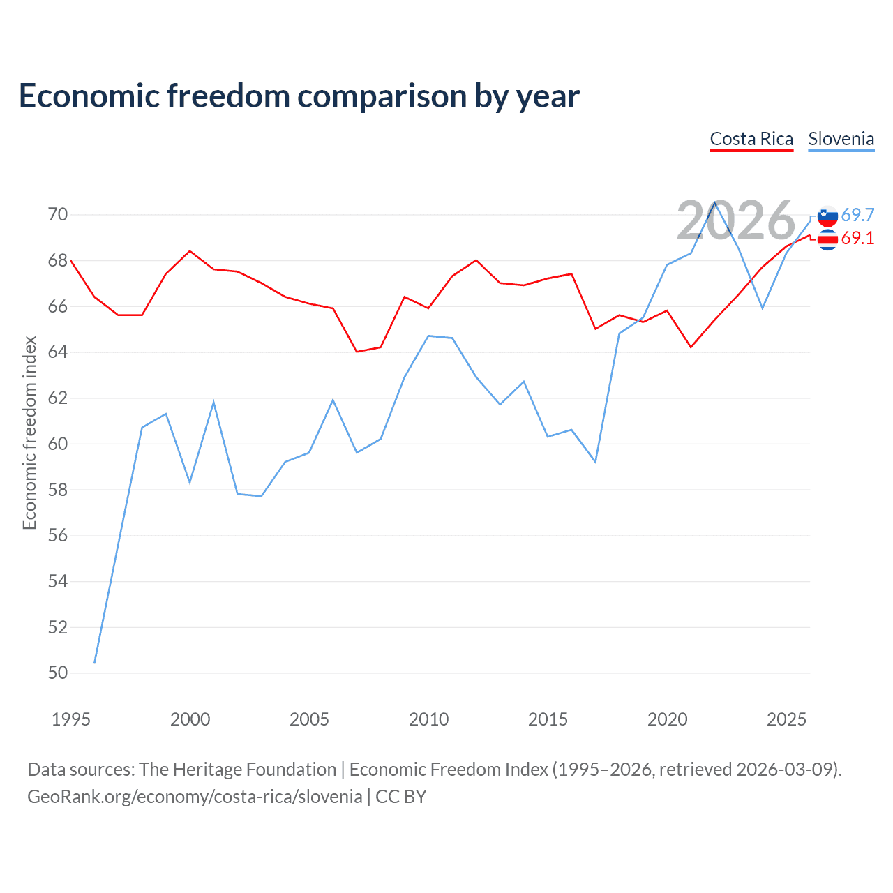 The Economic Freedom Index for Costa Rica is 68.6, ranking 47/197, compared to 68.3 for Slovenia, ranking 49/197. The chart below displays a comparison of annual changes in economic freedom indexes.