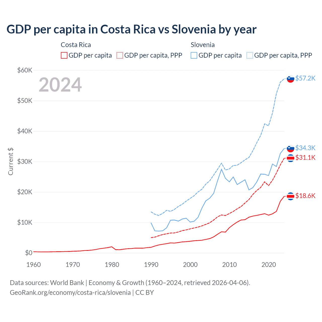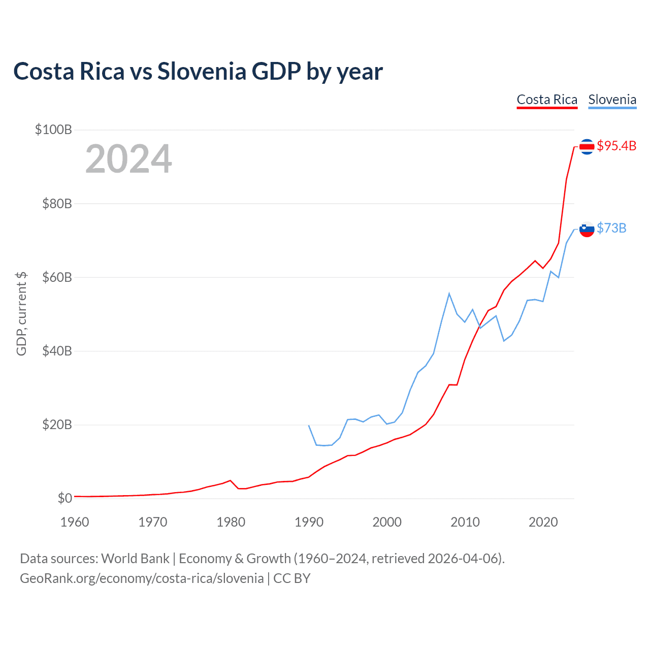 Costa Rica has a GDP of $95.4B compared to $73B for Slovenia, ranking 73/197 and 86/197 by economy size, respectively.