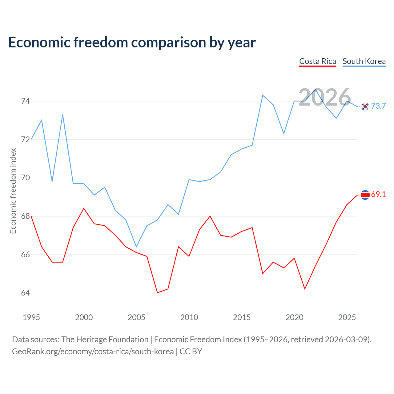 The Economic Freedom Index for Costa Rica is 69.1, ranking 43/197, compared to 73.7 for South Korea, ranking 24/197. The chart above displays a comparison of annual changes in economic freedom indexes.