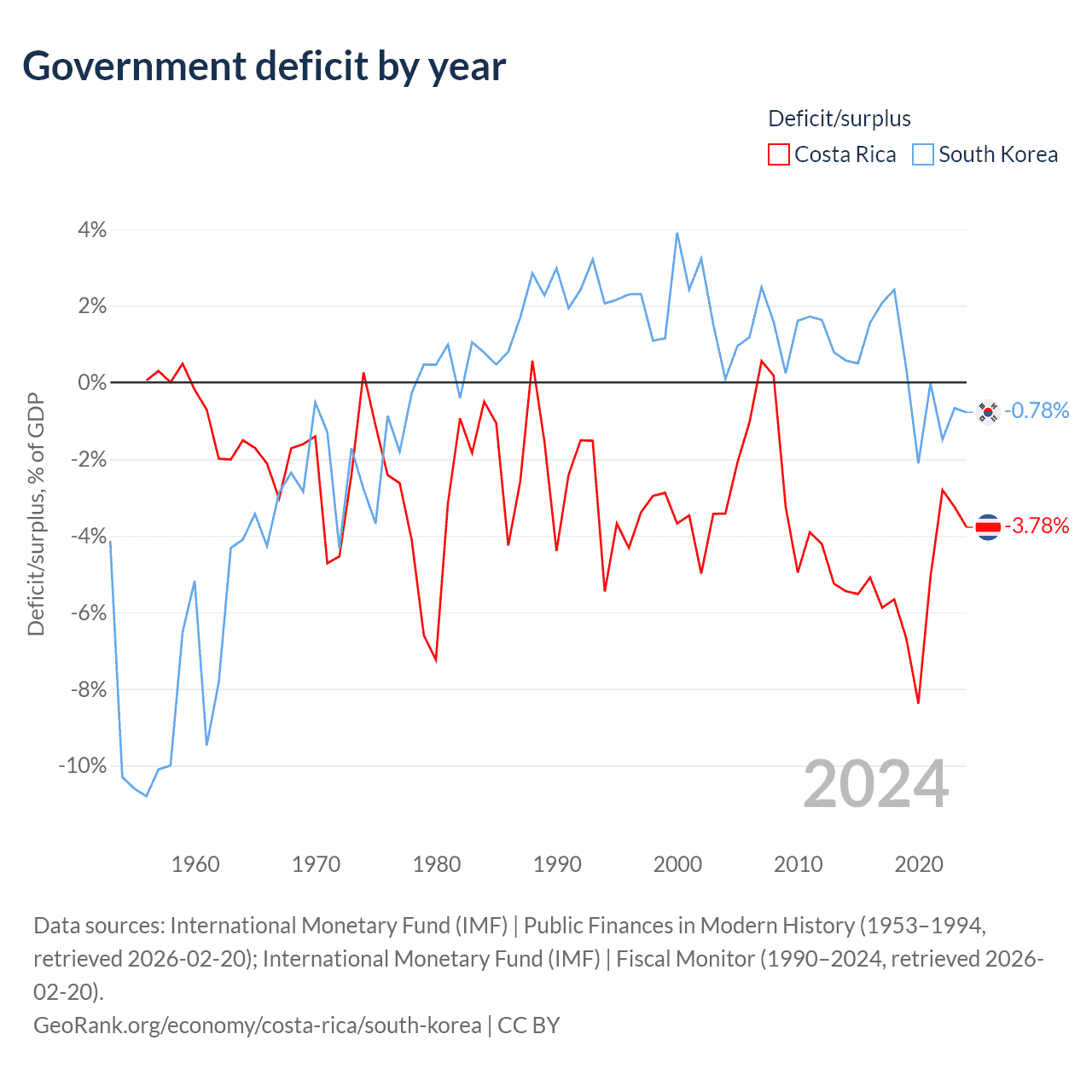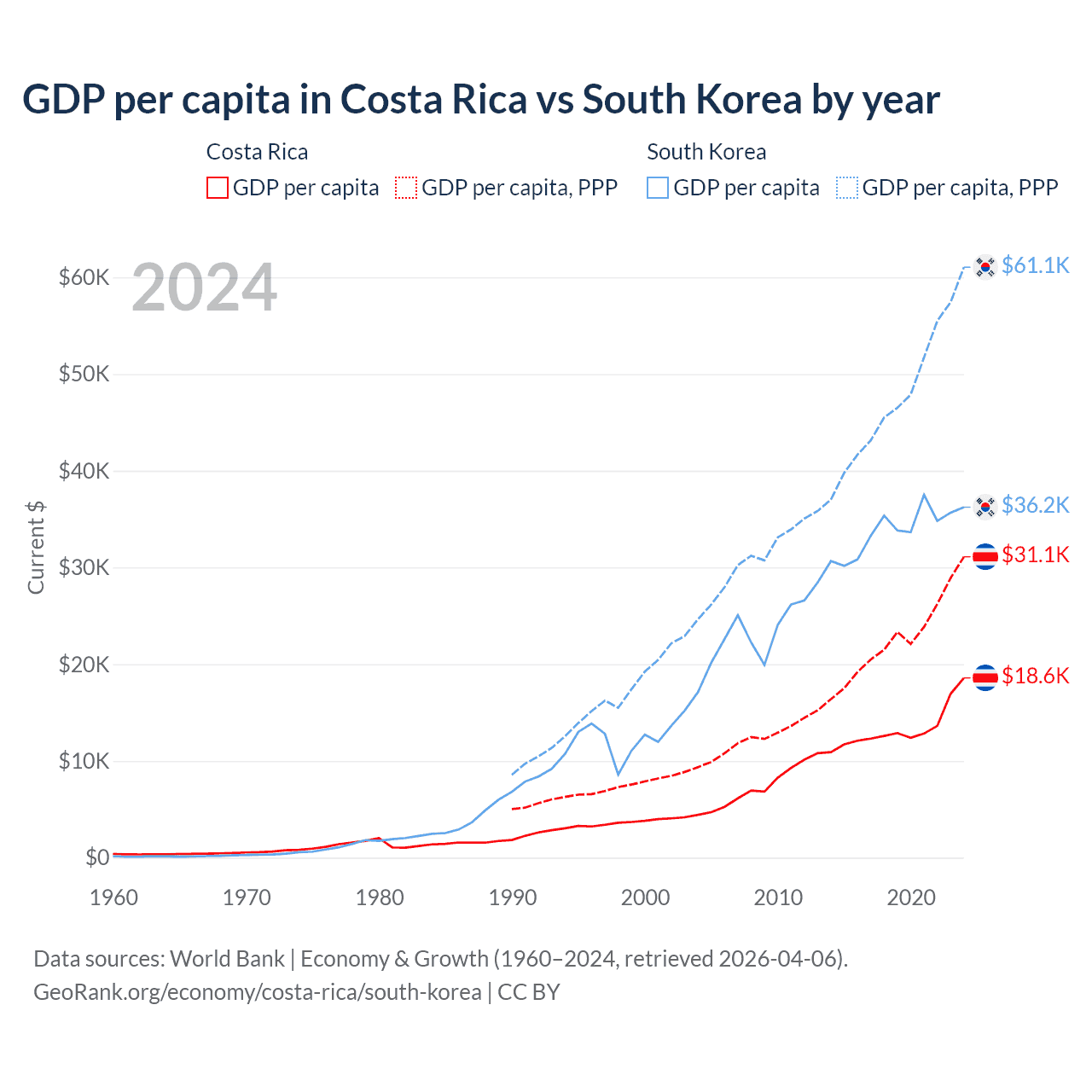 Costa Rica has a GDP of $95.4B compared to $1.88T for South Korea, ranking 73/197 and 12/197 by economy size, respectively.