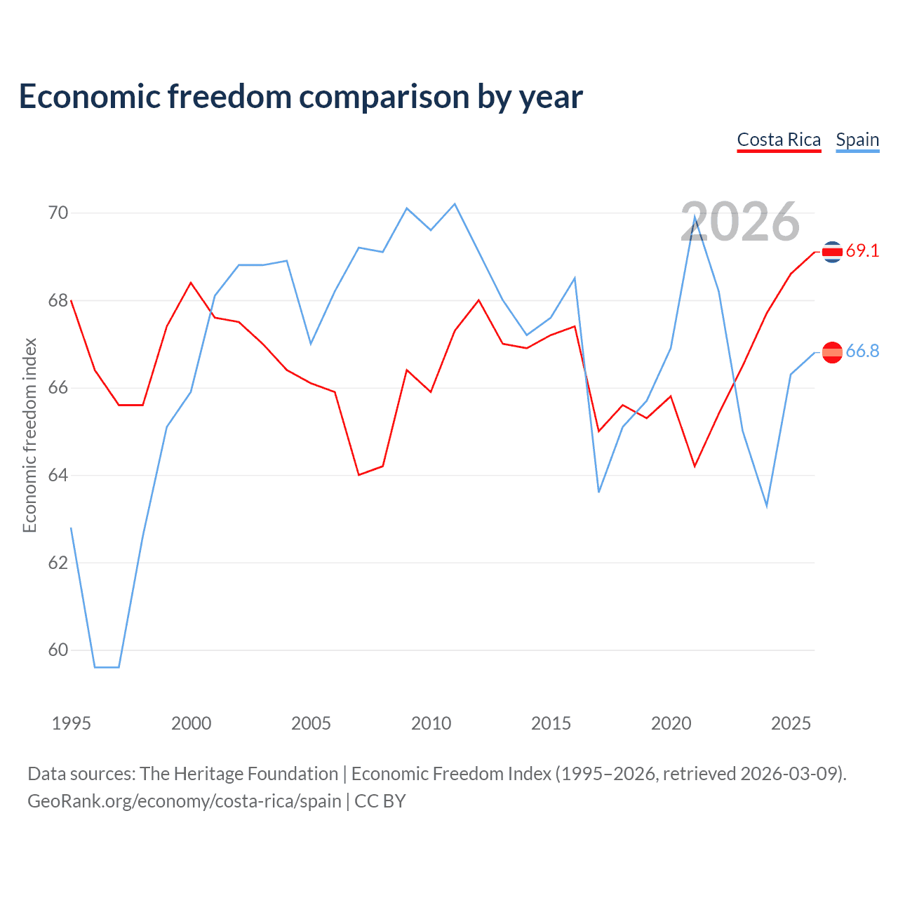 The Economic Freedom Index for Costa Rica is 69.1, ranking 43/197, compared to 66.8 for Spain, ranking 59/197. The chart above displays a comparison of annual changes in economic freedom indexes.