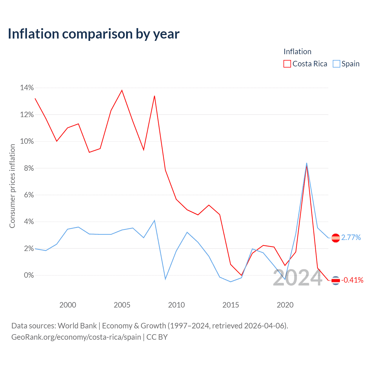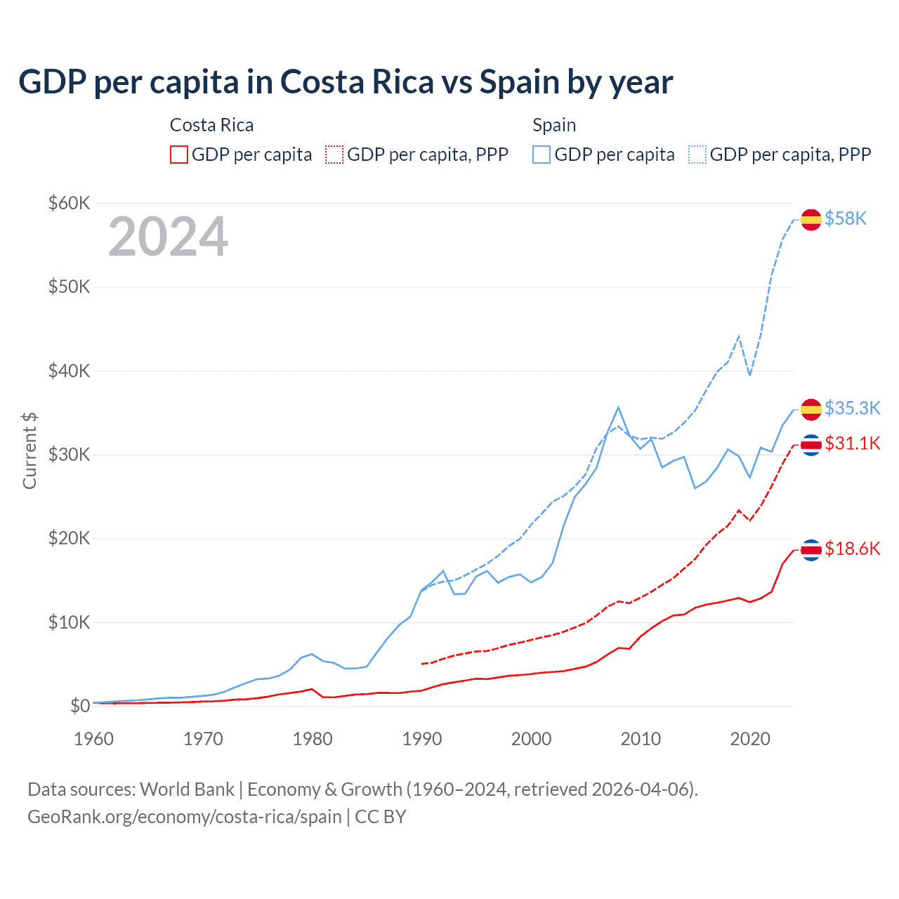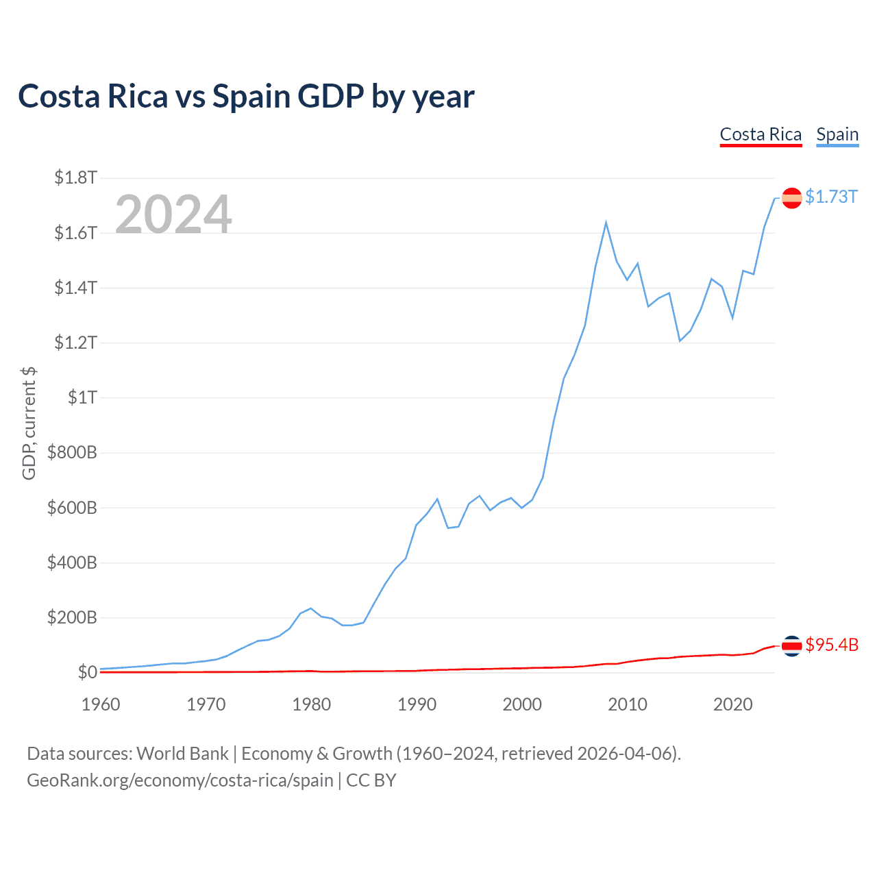 Costa Rica has a GDP of $95.4B compared to $1.73T for Spain, ranking 73/197 and 15/197 by economy size, respectively.