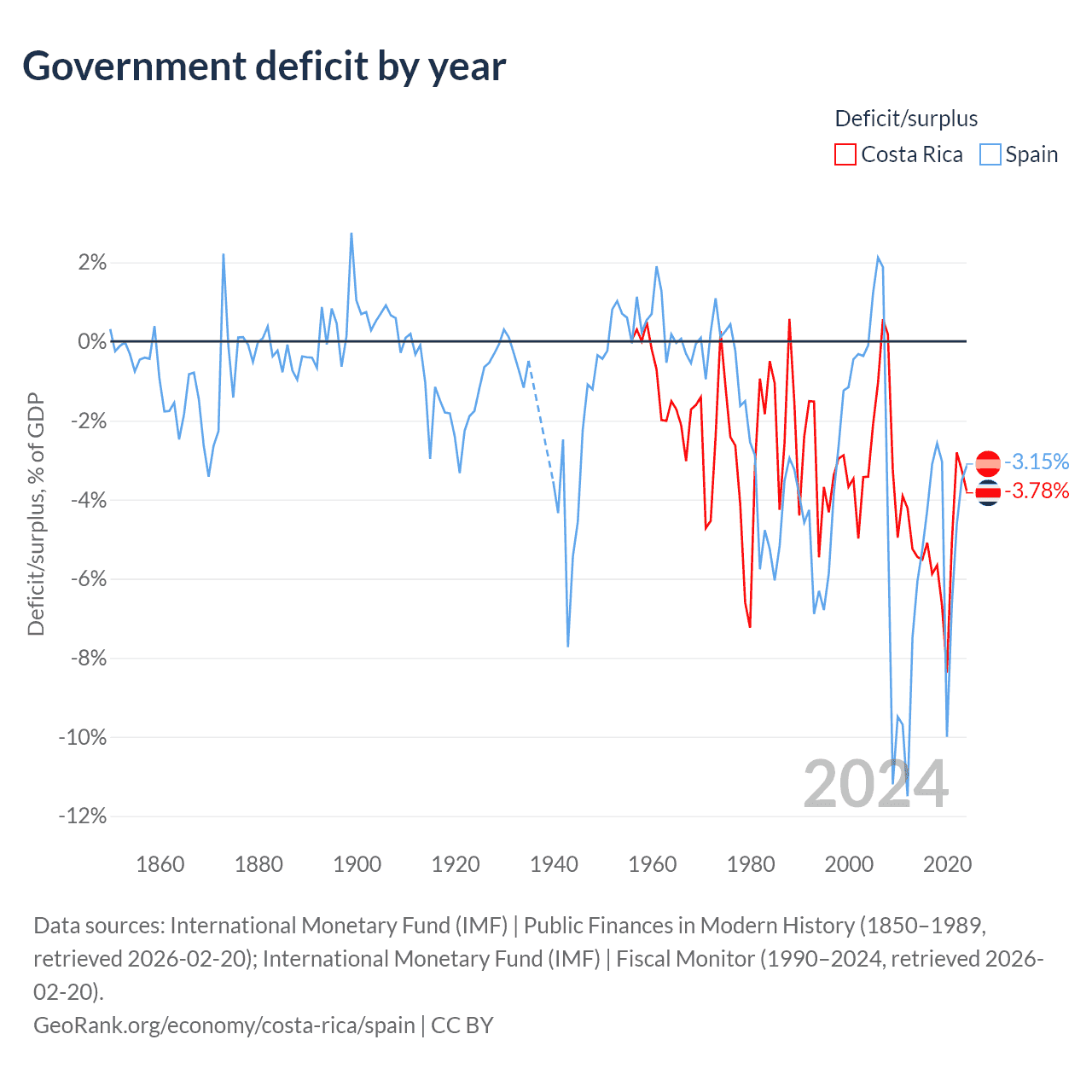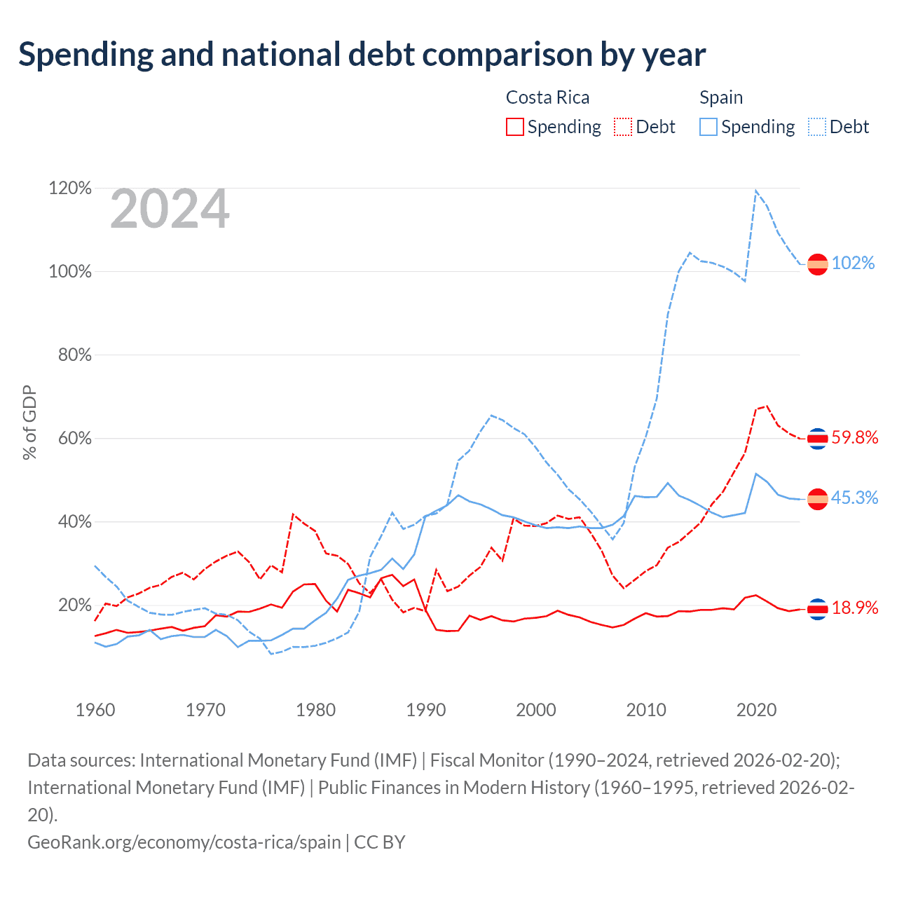 Costa Rica has $57B in government debt (59.8% of GDP), compared to $1.75T (101.6% of GDP) in Spain.
