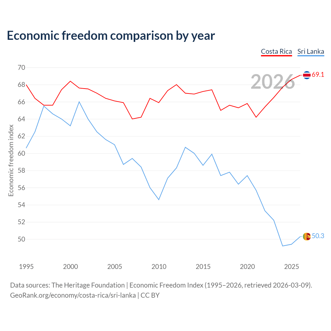The Economic Freedom Index for Costa Rica is 69.1, ranking 43/197, compared to 50.3 for Sri Lanka, ranking 162/197. The chart above displays a comparison of annual changes in economic freedom indexes.