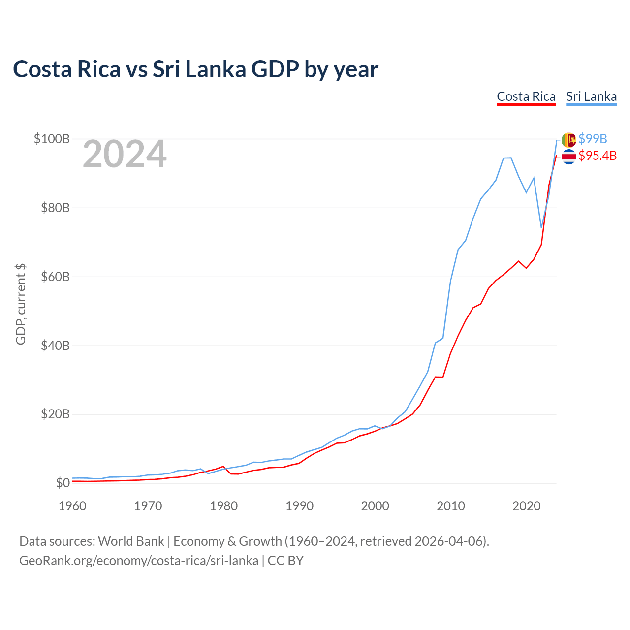 Costa Rica has a GDP of $95.4B compared to $99B for Sri Lanka, ranking 73/197 and 72/197 by economy size, respectively.