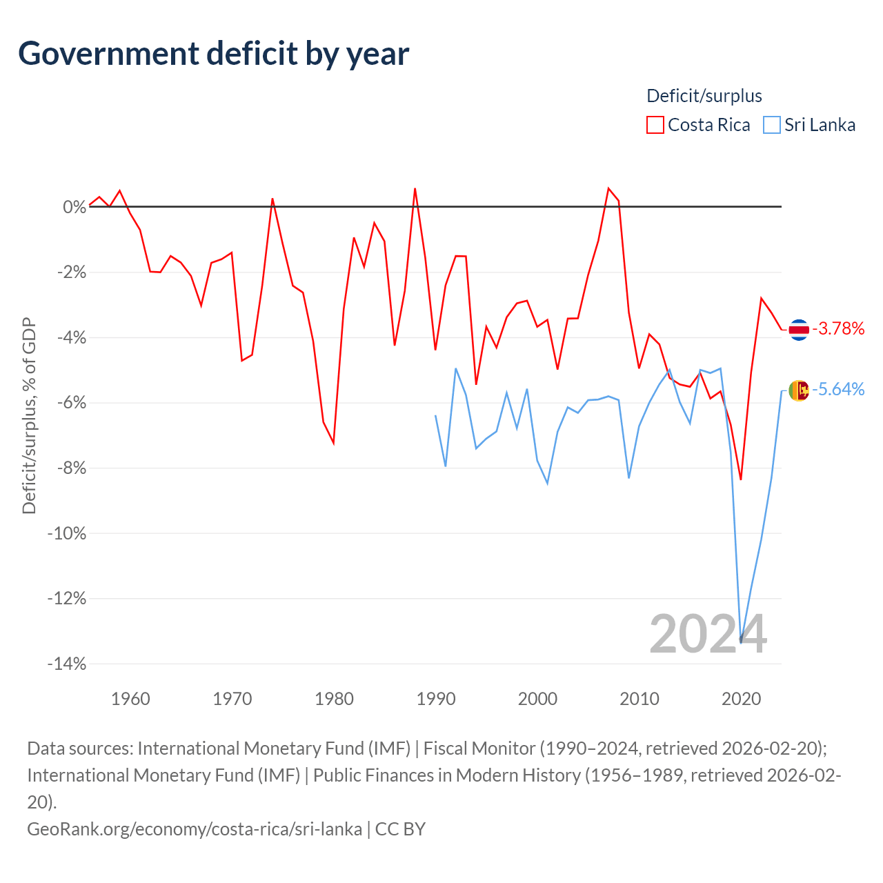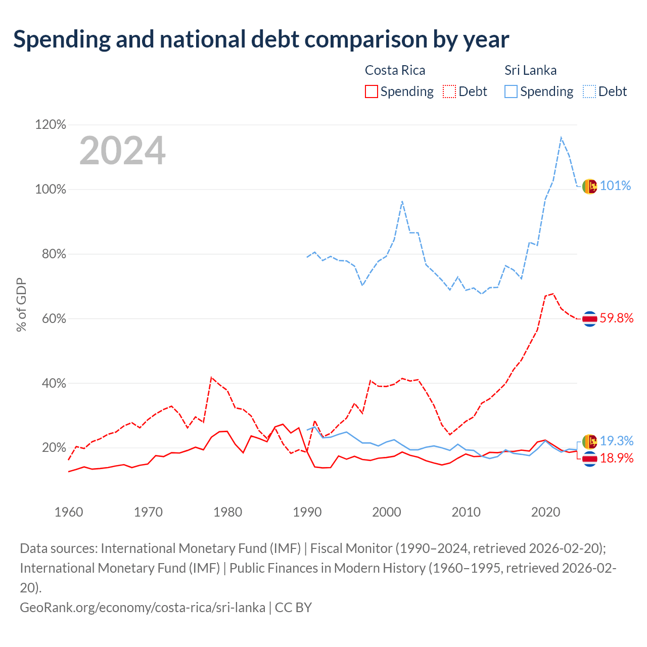 Costa Rica has $57B in government debt (59.8% of GDP), compared to $99.8B (100.8% of GDP) in Sri Lanka.