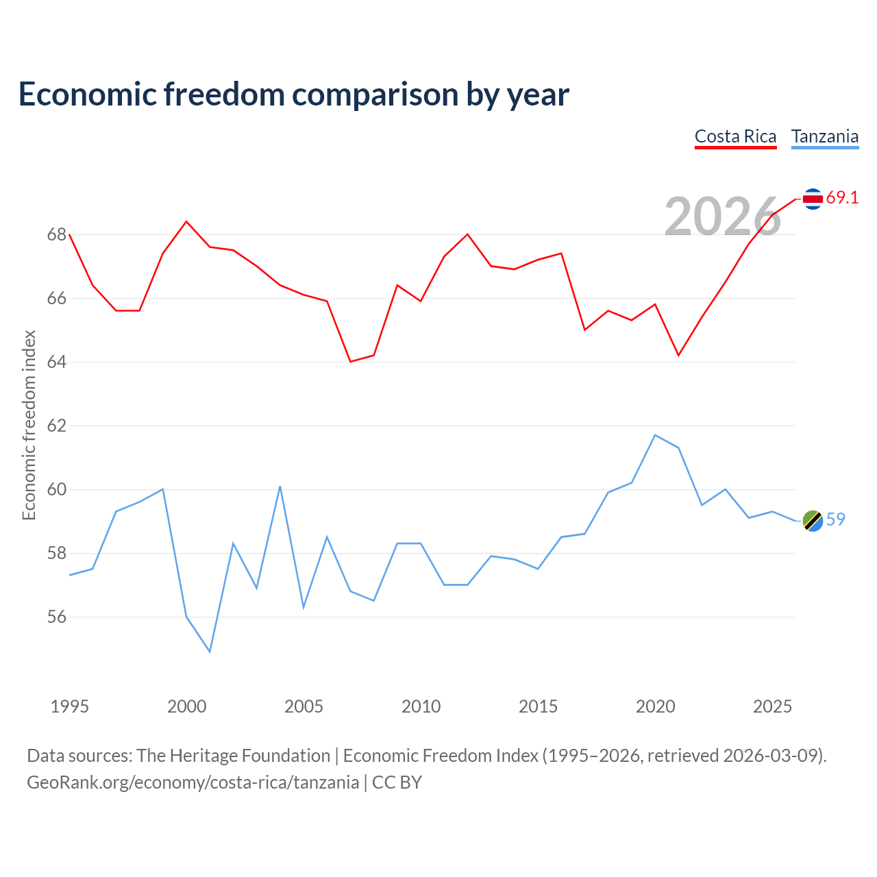 The Economic Freedom Index for Costa Rica is 69.1, ranking 43/197, compared to 59 for Tanzania, ranking 106/197. The chart above displays a comparison of annual changes in economic freedom indexes.