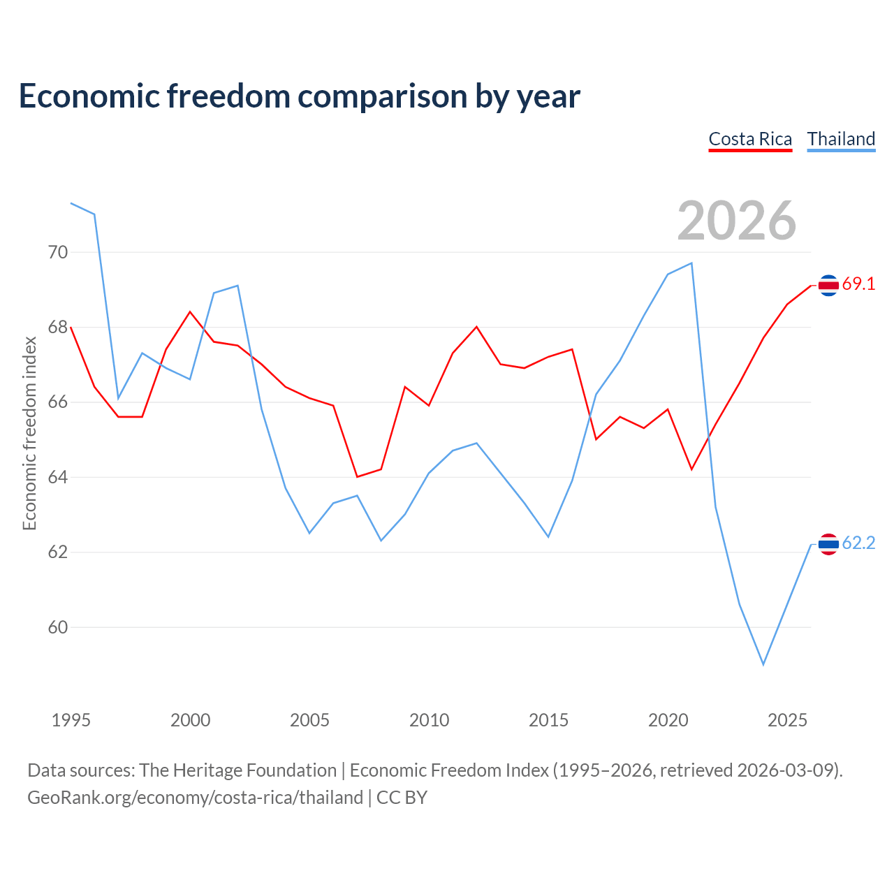 The Economic Freedom Index for Costa Rica is 69.1, ranking 43/197, compared to 62.2 for Thailand, ranking 88/197. The chart above displays a comparison of annual changes in economic freedom indexes.