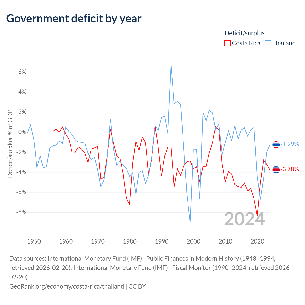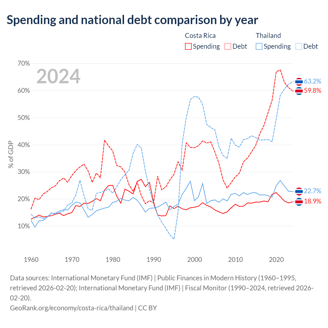 Costa Rica has $57B in government debt (59.8% of GDP), compared to $333B (63.2% of GDP) in Thailand.