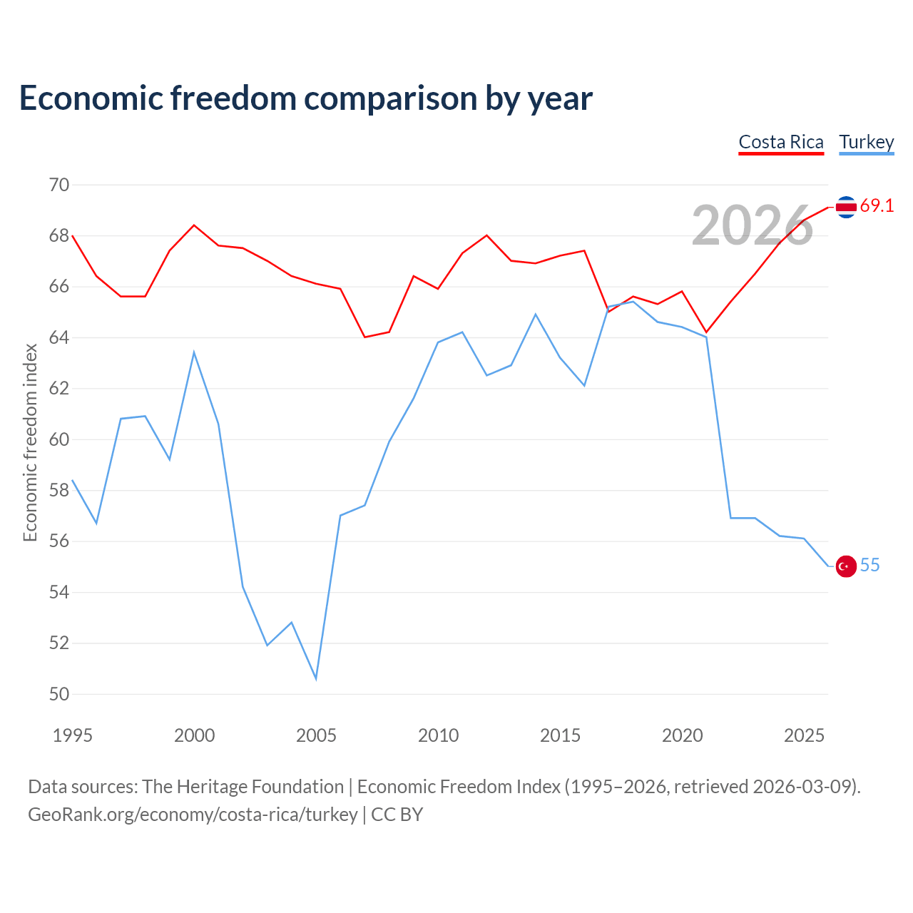 The Economic Freedom Index for Costa Rica is 69.1, ranking 43/197, compared to 55 for Turkey, ranking 129/197. The chart above displays a comparison of annual changes in economic freedom indexes.