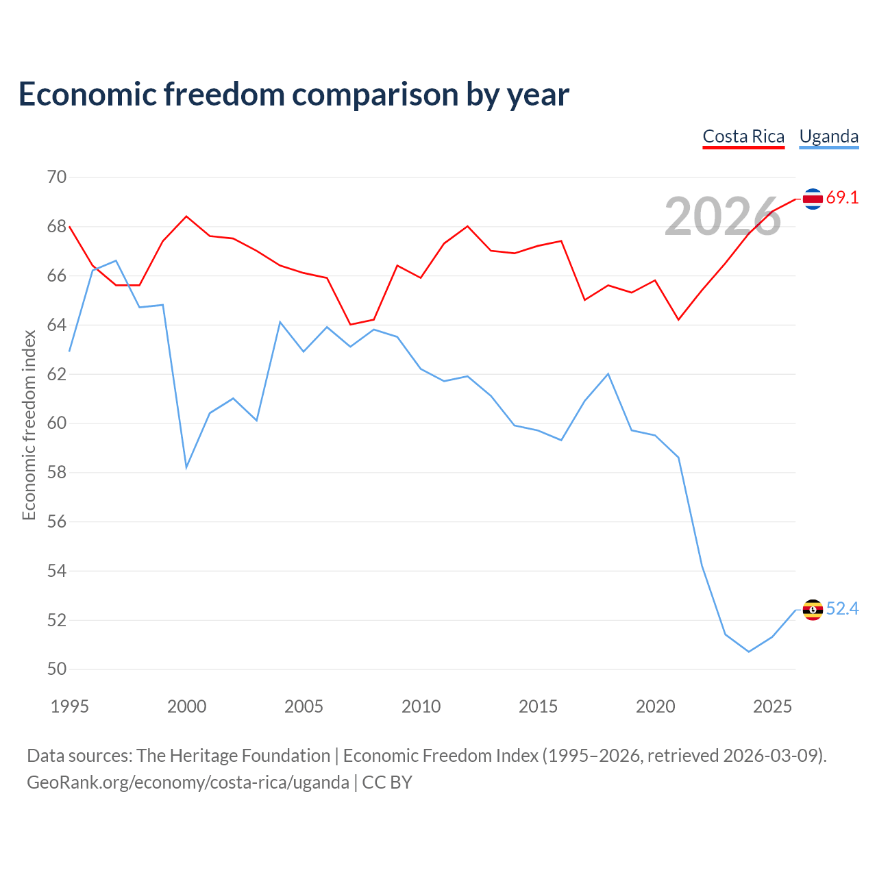 The Economic Freedom Index for Costa Rica is 69.1, ranking 43/197, compared to 52.4 for Uganda, ranking 149/197. The chart above displays a comparison of annual changes in economic freedom indexes.