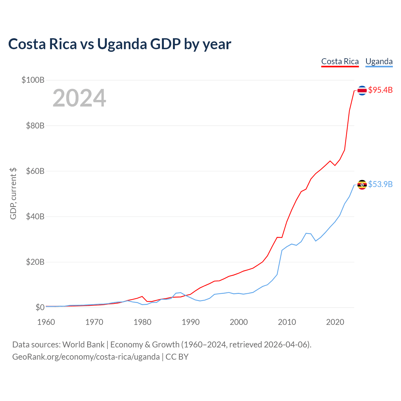 Costa Rica has a GDP of $95.4B compared to $53.9B for Uganda, ranking 73/197 and 89/197 by economy size, respectively.
