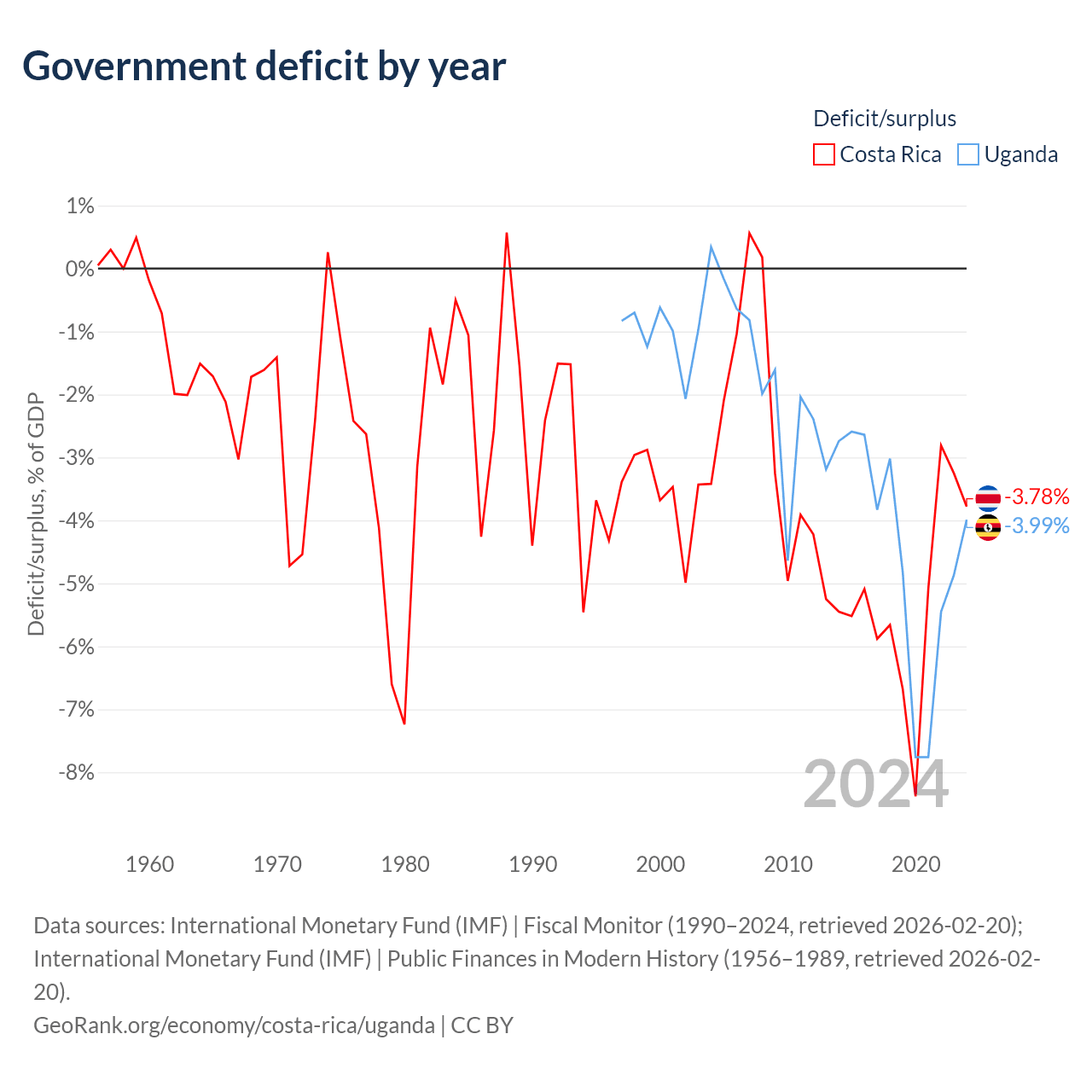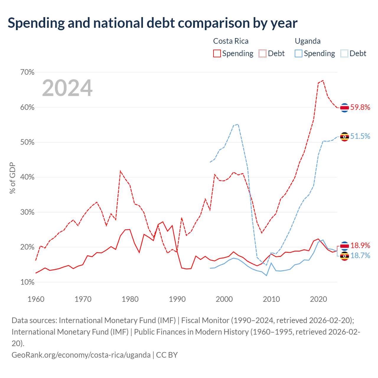 Costa Rica has $57B in government debt (59.8% of GDP), compared to $27.8B (51.5% of GDP) in Uganda.