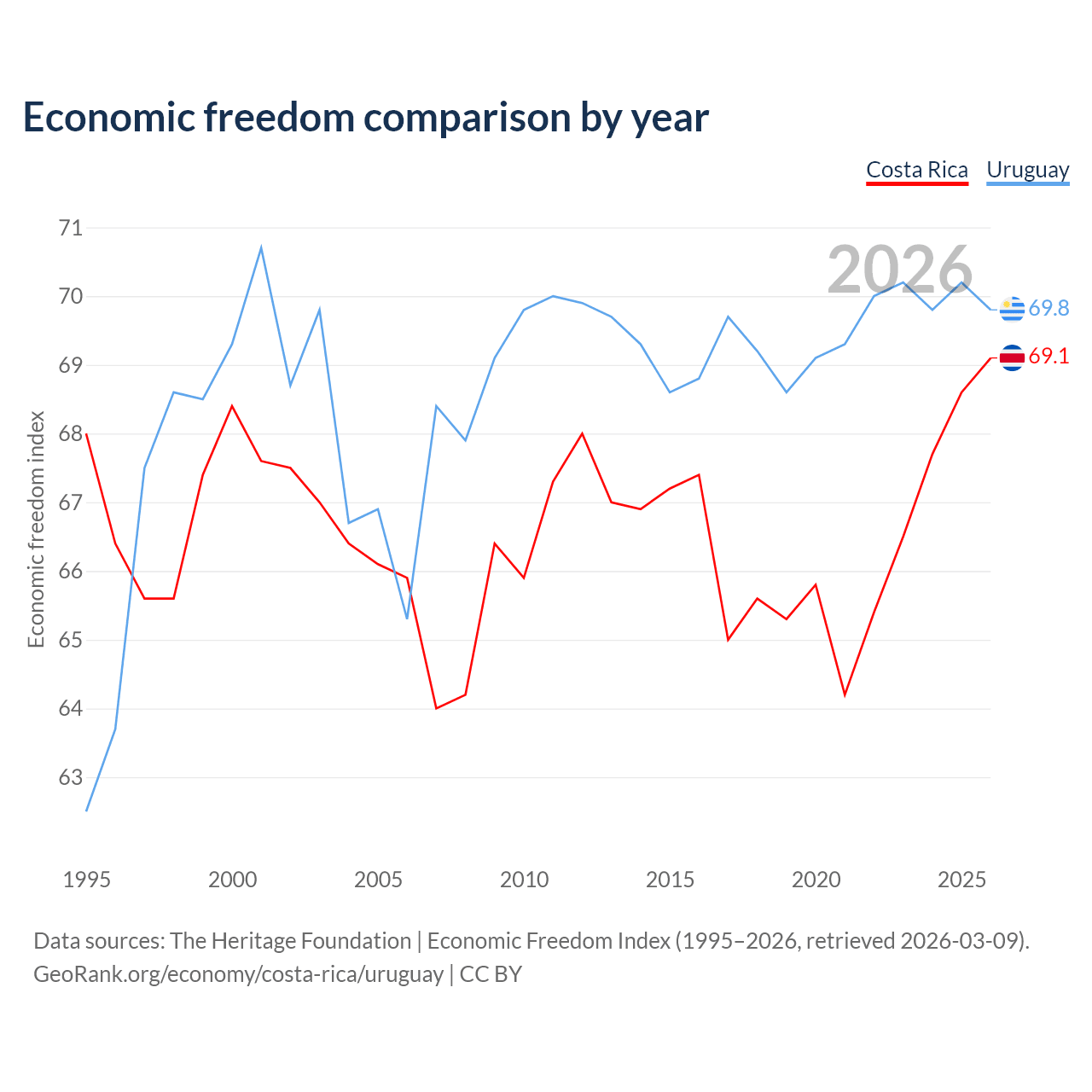 The Economic Freedom Index for Costa Rica is 69.1, ranking 43/197, compared to 69.8 for Uruguay, ranking 39/197. The chart above displays a comparison of annual changes in economic freedom indexes.
