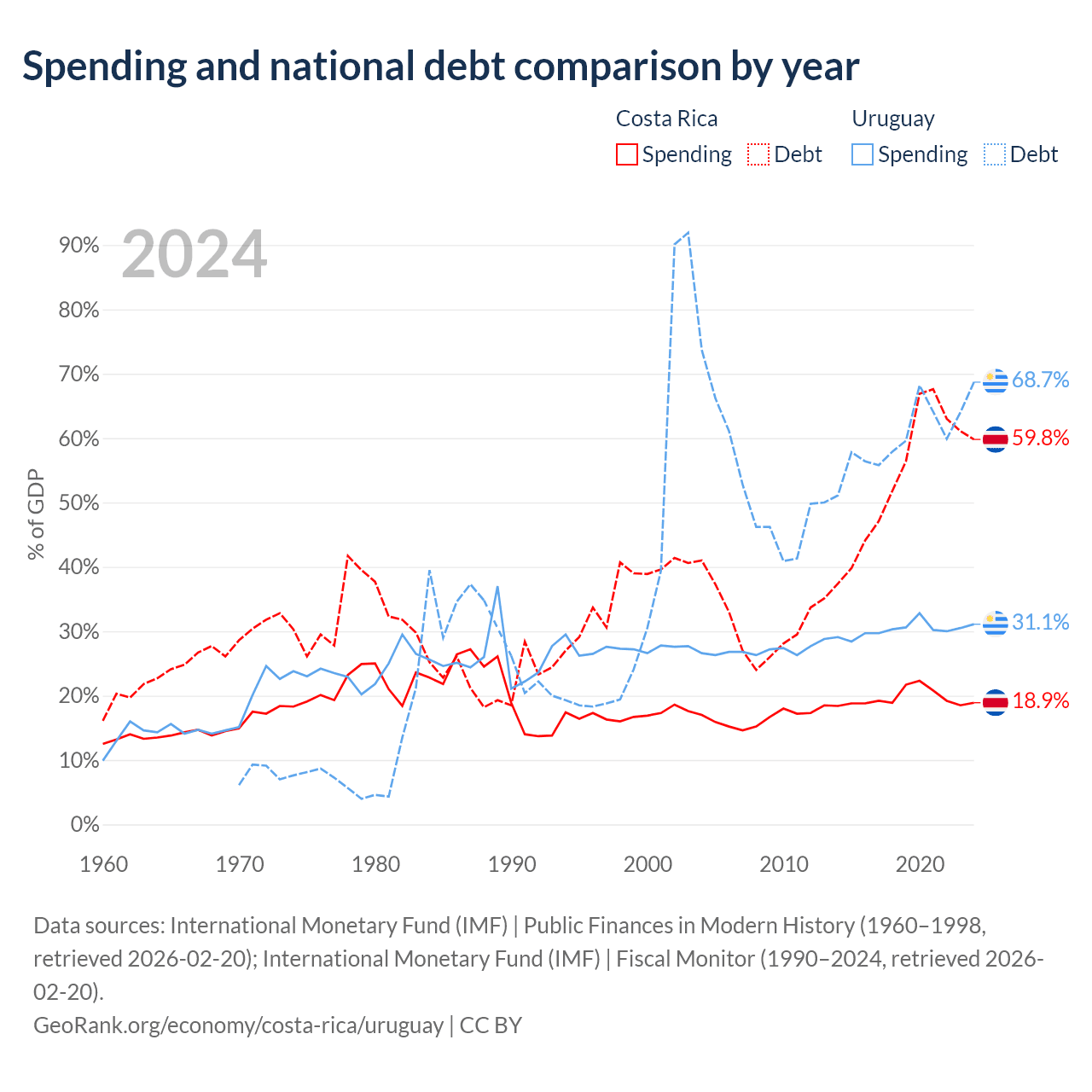 Costa Rica has $57B in government debt (59.8% of GDP), compared to $55.6B (68.7% of GDP) in Uruguay.