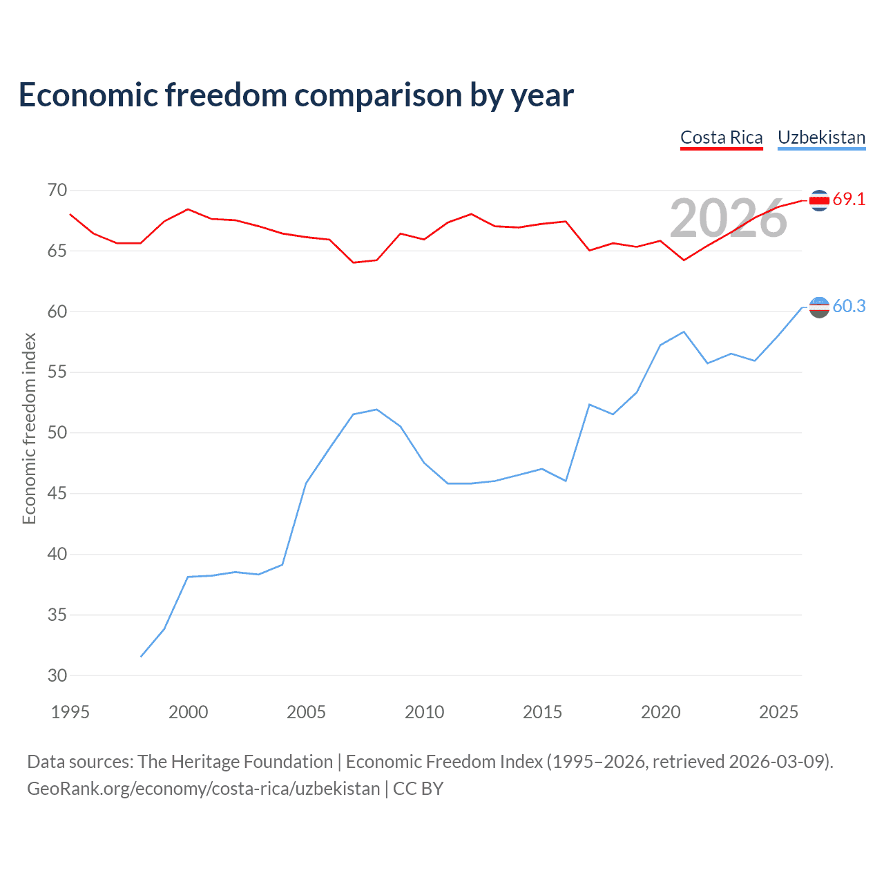The Economic Freedom Index for Costa Rica is 69.1, ranking 43/197, compared to 60.3 for Uzbekistan, ranking 94/197. The chart above displays a comparison of annual changes in economic freedom indexes.