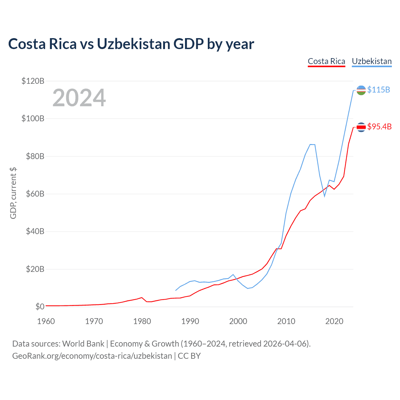 Costa Rica has a GDP of $95.4B compared to $115B for Uzbekistan, ranking 73/197 and 66/197 by economy size, respectively.