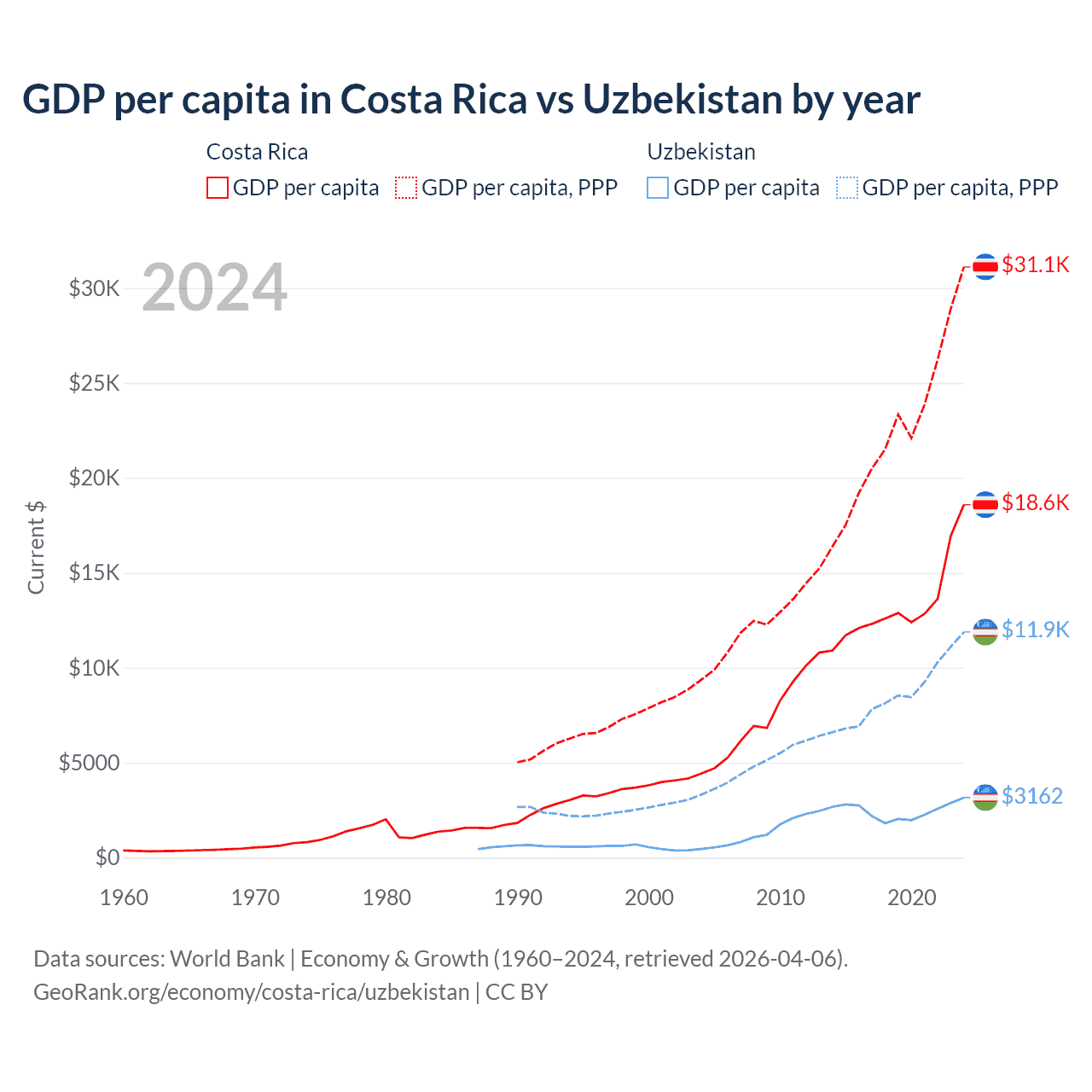 GDP per capita in Costa Rica vs Uzbekistan by year