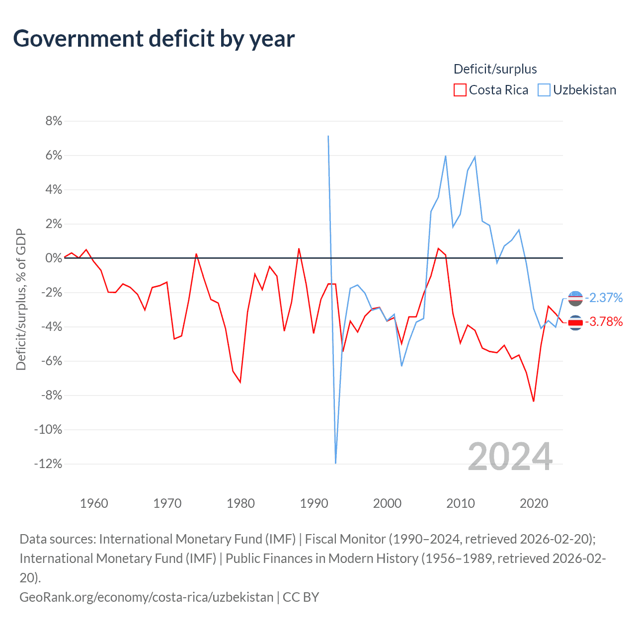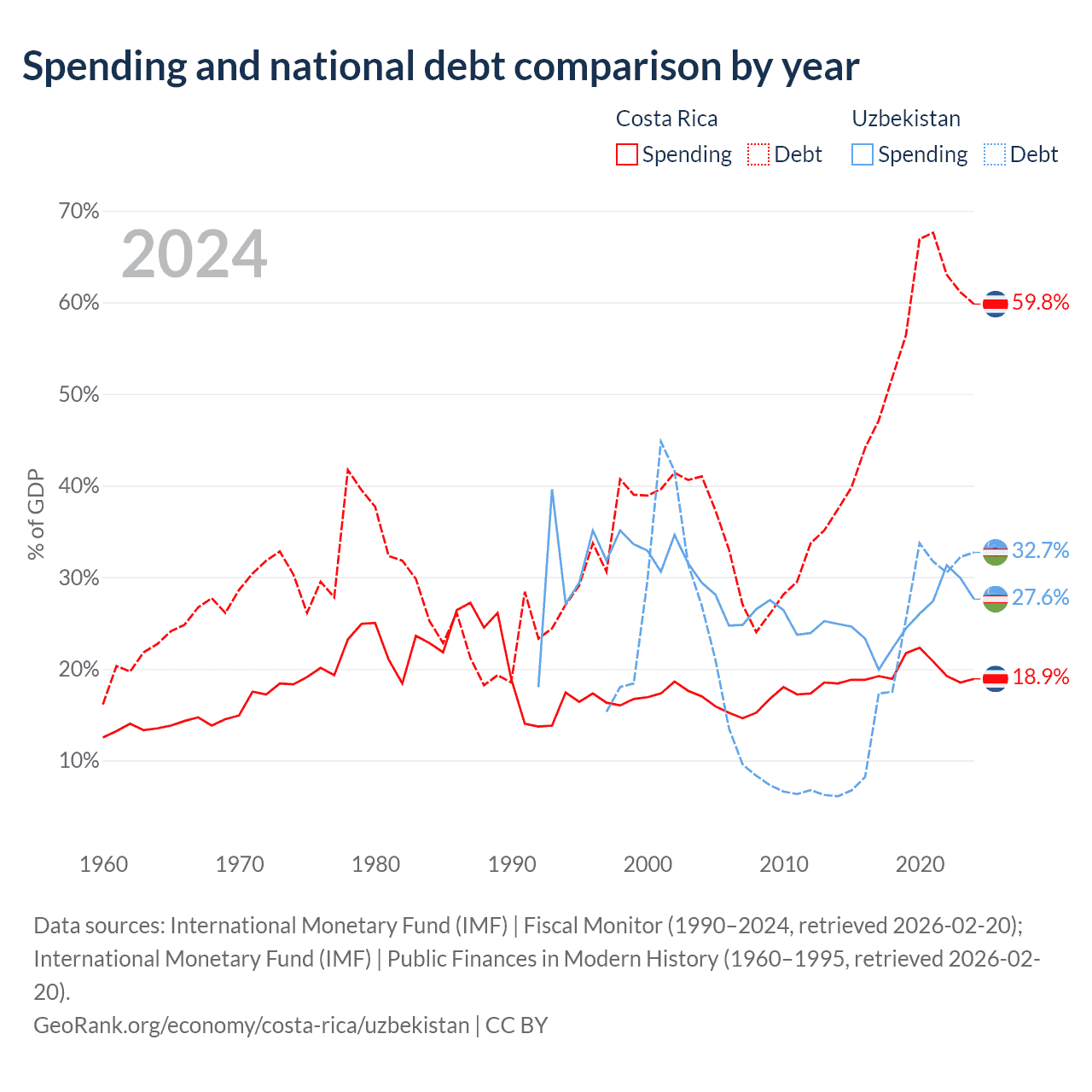 Costa Rica has $57B in government debt (59.8% of GDP), compared to $37.5B (32.7% of GDP) in Uzbekistan.