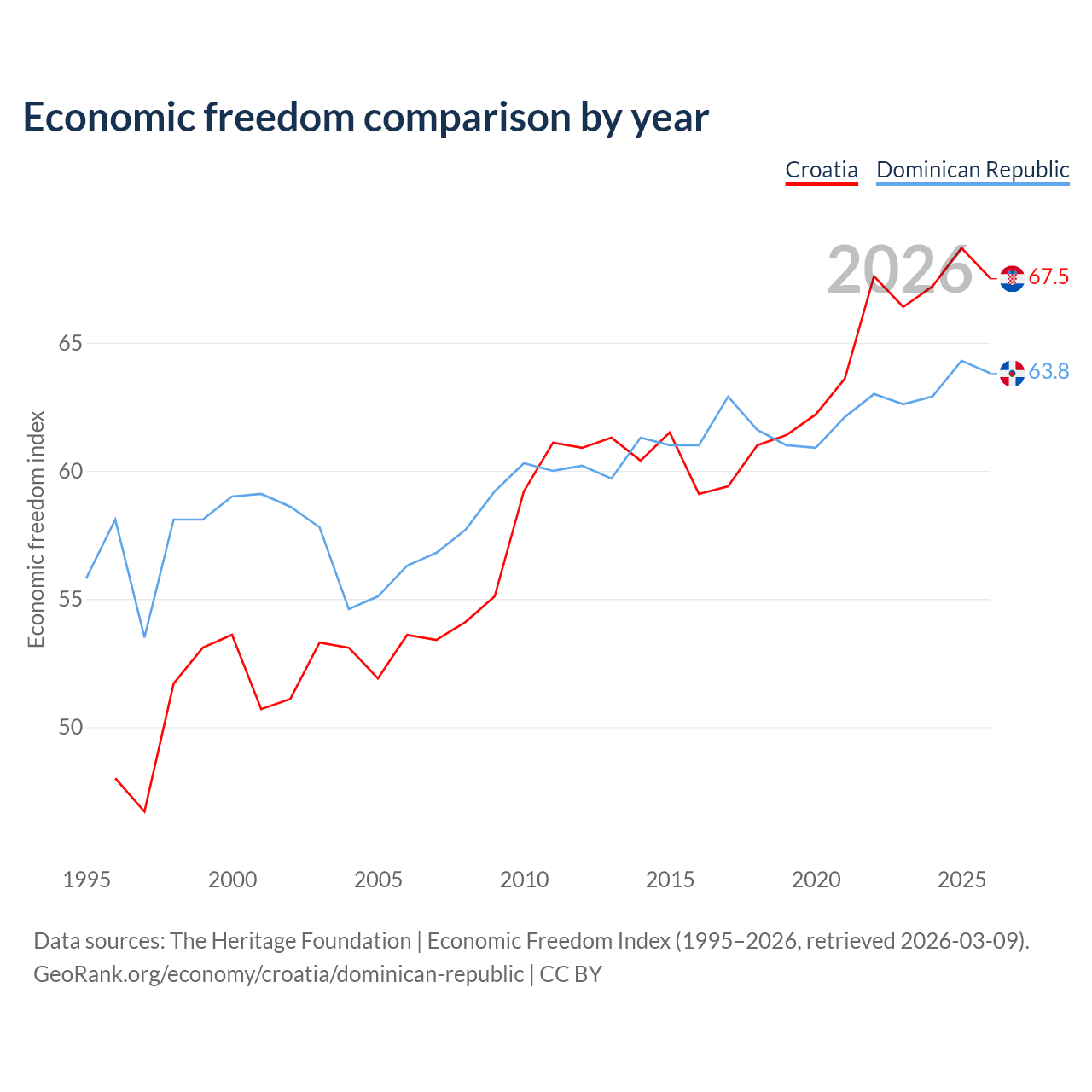 The Economic Freedom Index for Croatia is 67.5, ranking 56/197, compared to 63.8 for the Dominican Republic, ranking 77/197. The chart above displays a comparison of annual changes in economic freedom indexes.