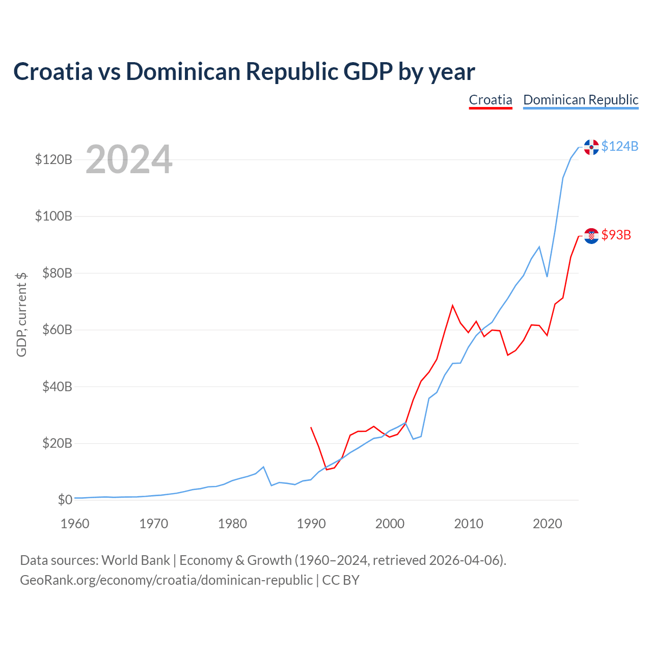 Croatia has a GDP of $93B compared to $124B for the Dominican Republic, ranking 75/197 and 63/197 by economy size, respectively.