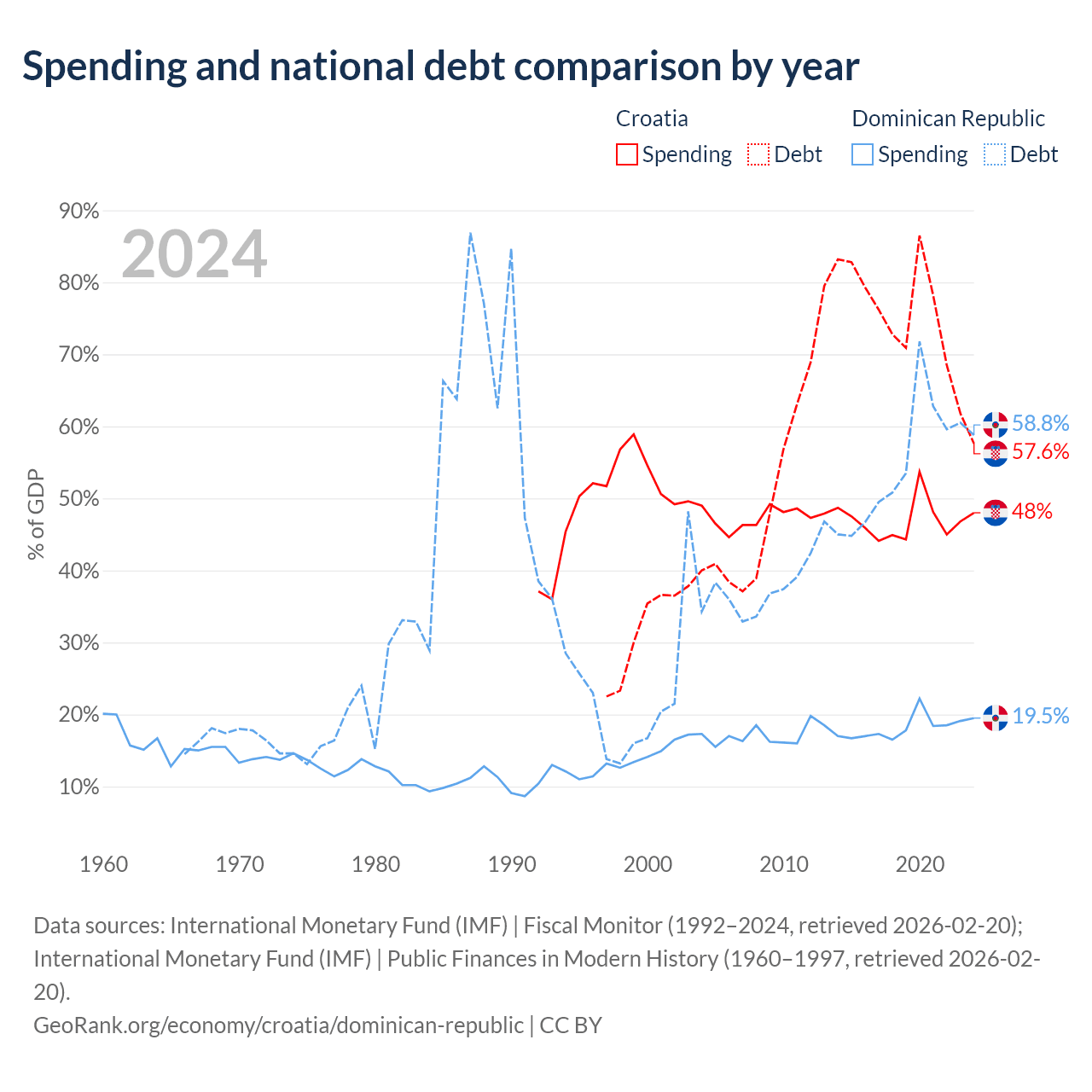 Croatia has $53.5B in government debt (57.6% of GDP), compared to $73.1B (58.8% of GDP) in the Dominican Republic.
