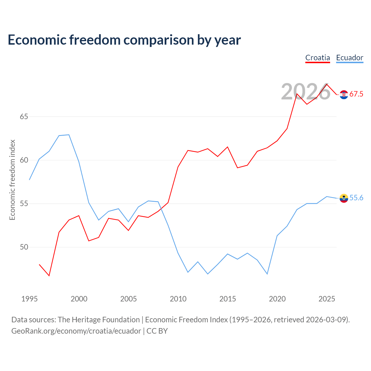 The Economic Freedom Index for Croatia is 67.5, ranking 56/197, compared to 55.6 for Ecuador, ranking 127/197. The chart above displays a comparison of annual changes in economic freedom indexes.