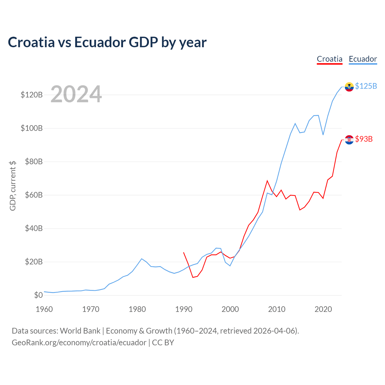 Croatia has a GDP of $93B compared to $125B for Ecuador, ranking 75/197 and 62/197 by economy size, respectively.