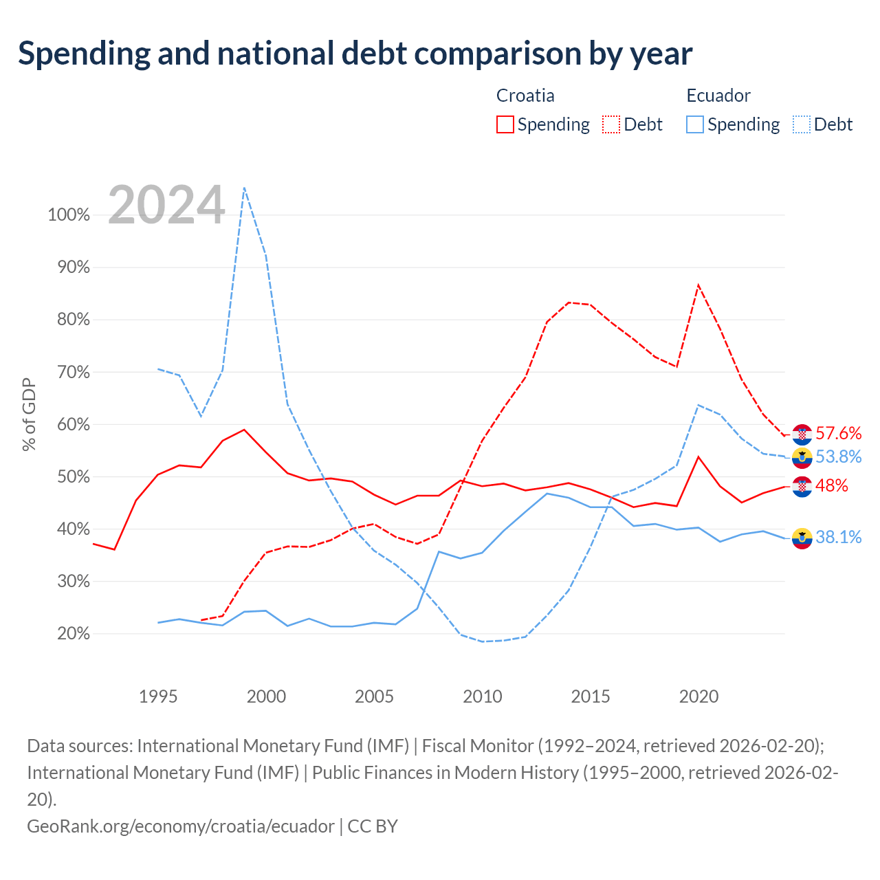 Croatia has $53.5B in government debt (57.6% of GDP), compared to $67B (53.8% of GDP) in Ecuador.