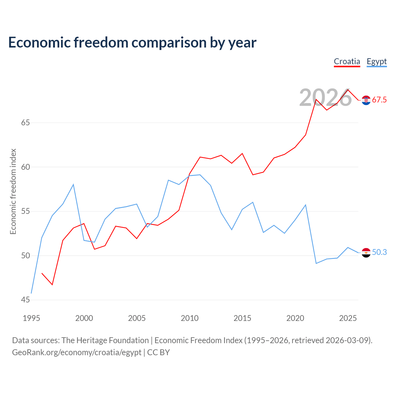 The Economic Freedom Index for Croatia is 67.5, ranking 56/197, compared to 50.3 for Egypt, ranking 160/197. The chart above displays a comparison of annual changes in economic freedom indexes.