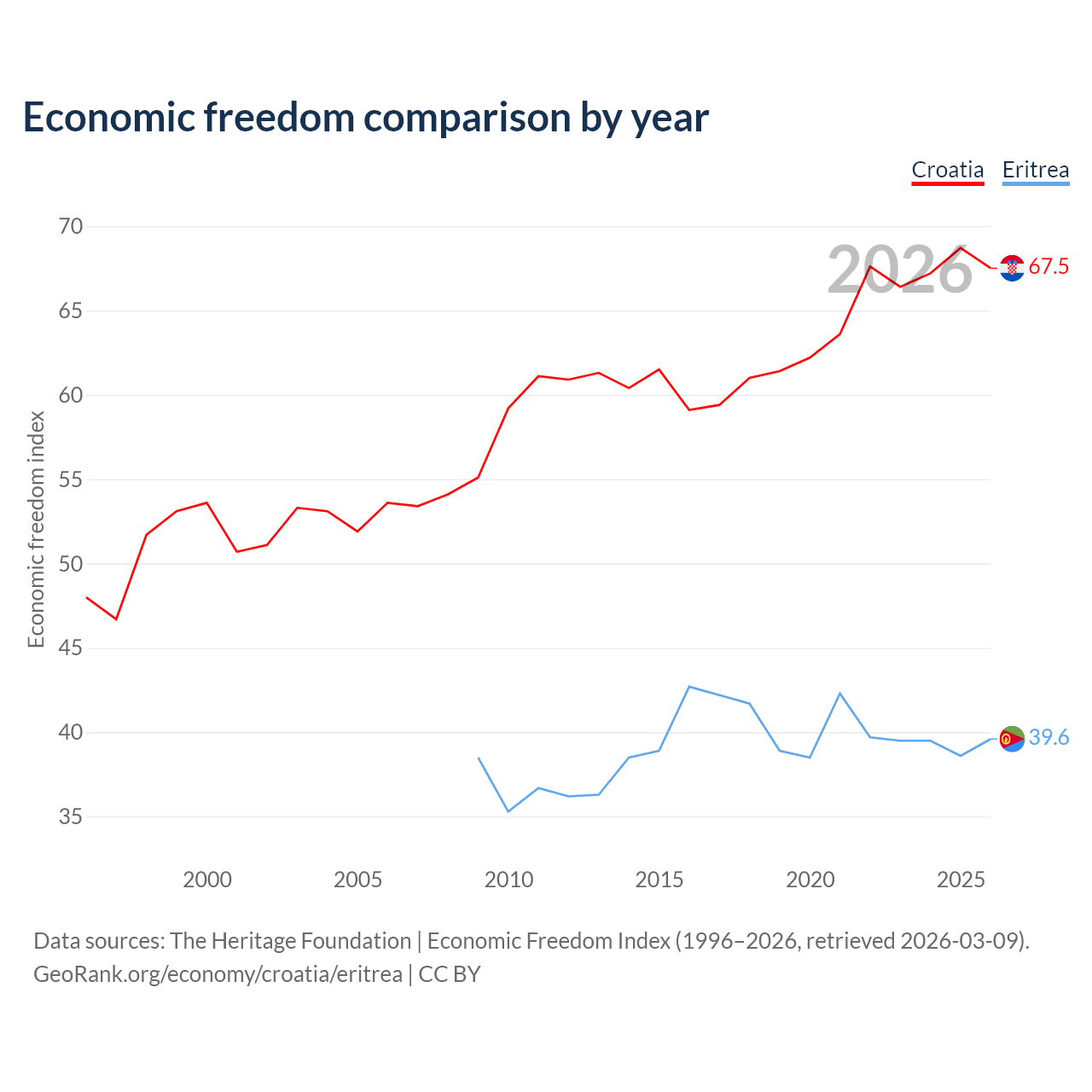 The Economic Freedom Index for Croatia is 67.5, ranking 56/197, compared to 39.6 for Eritrea, ranking 188/197. The chart above displays a comparison of annual changes in economic freedom indexes.