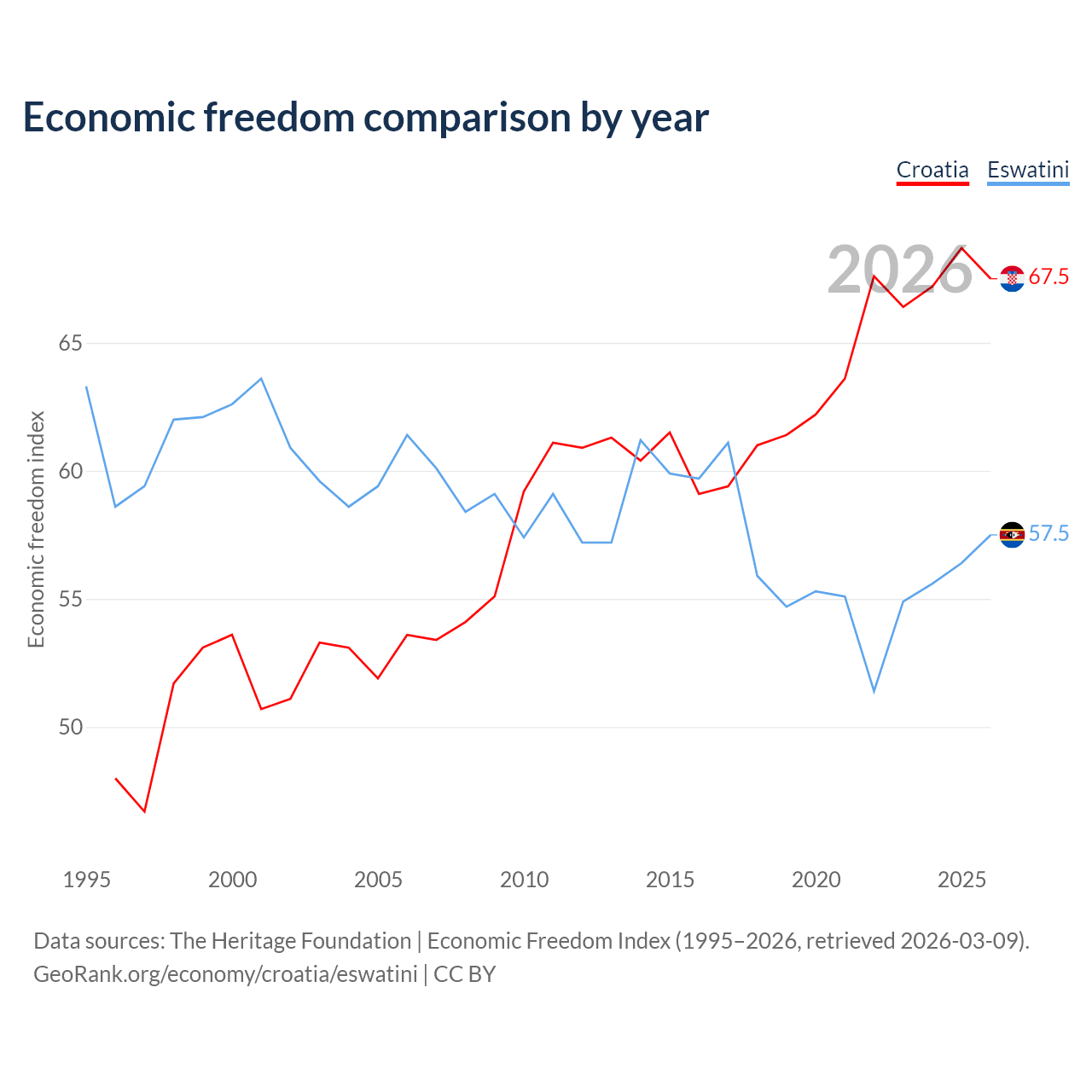 The Economic Freedom Index for Croatia is 67.5, ranking 56/197, compared to 57.5 for Eswatini, ranking 116/197. The chart above displays a comparison of annual changes in economic freedom indexes.