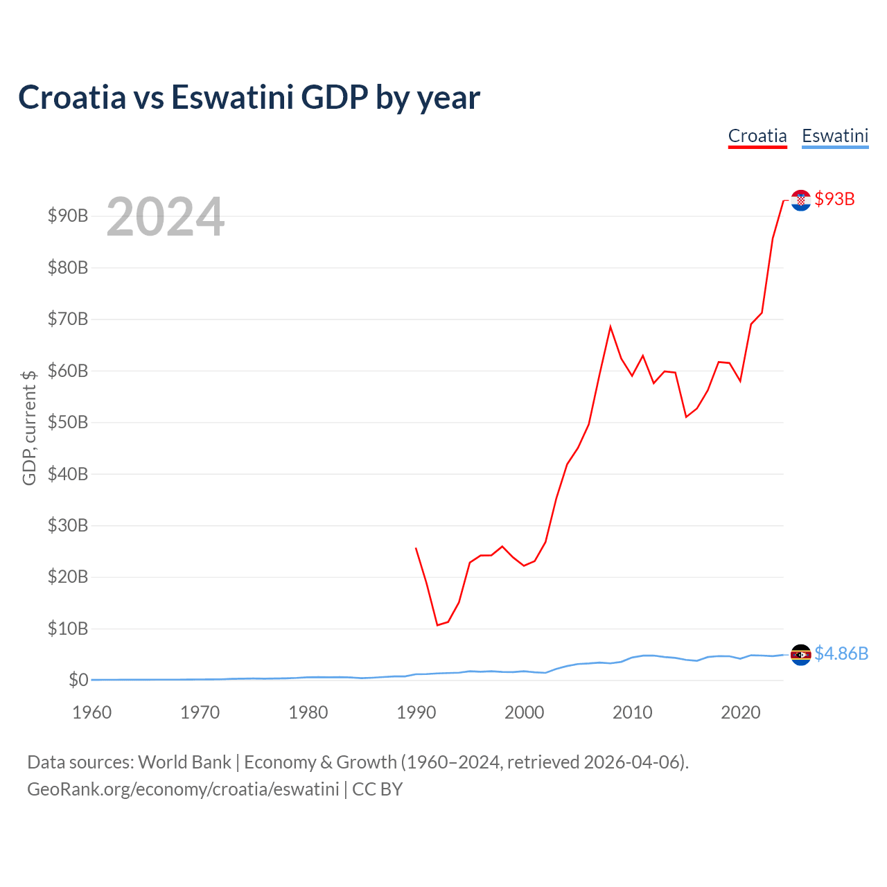 Croatia has a GDP of $93B compared to $4.86B for Eswatini, ranking 75/197 and 162/197 by economy size, respectively.