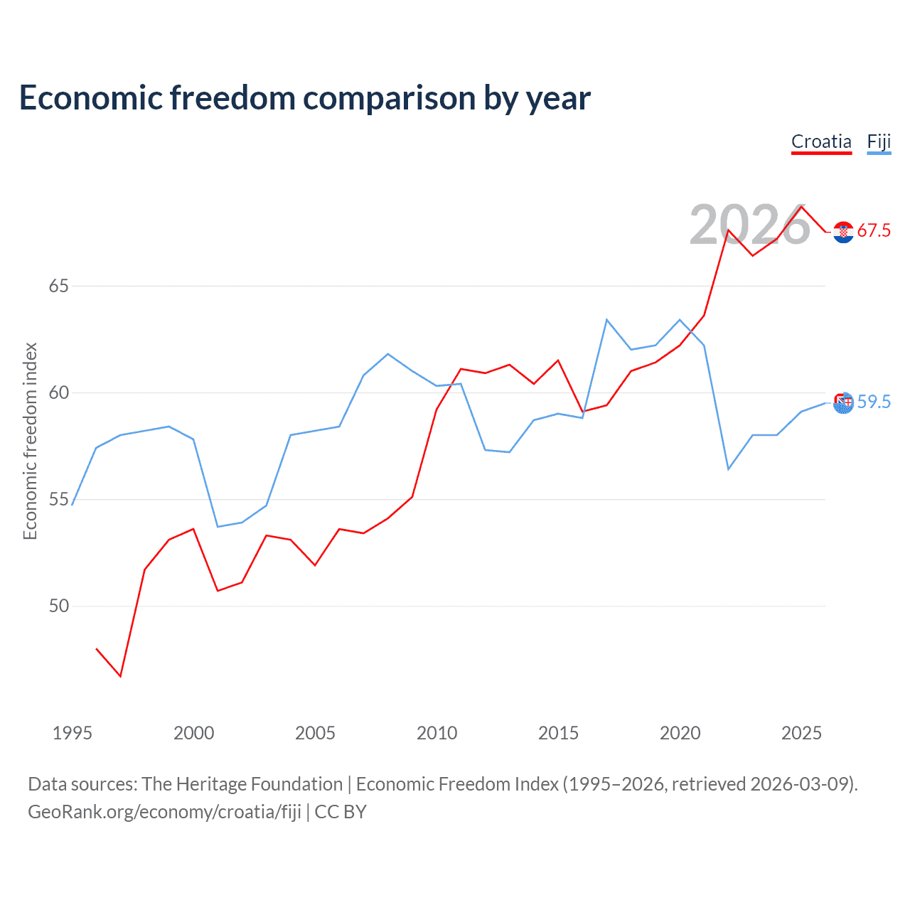 The Economic Freedom Index for Croatia is 67.5, ranking 56/197, compared to 59.5 for Fiji, ranking 103/197. The chart above displays a comparison of annual changes in economic freedom indexes.