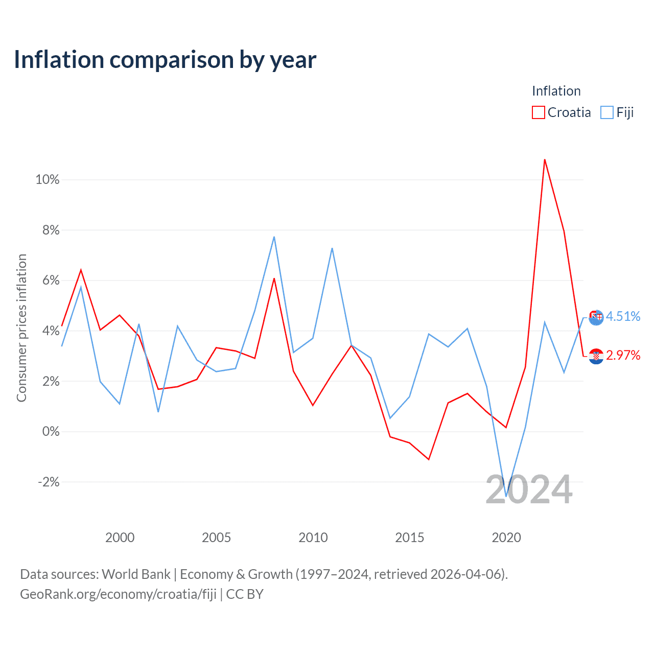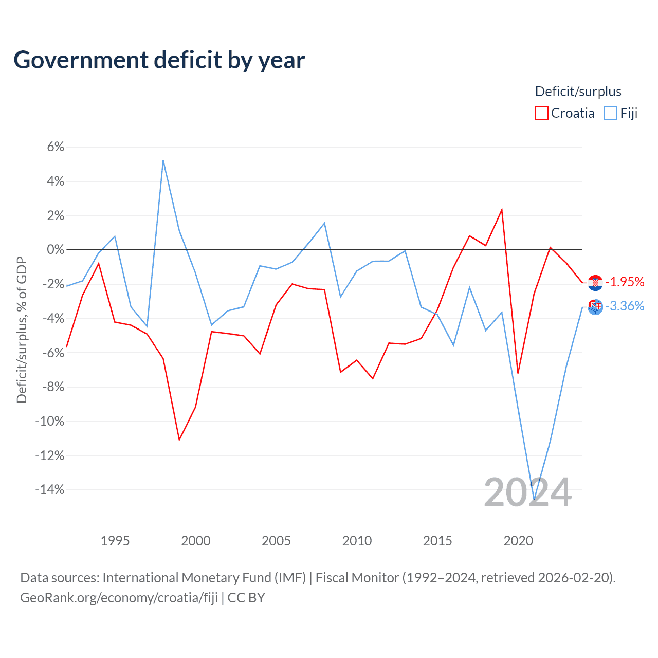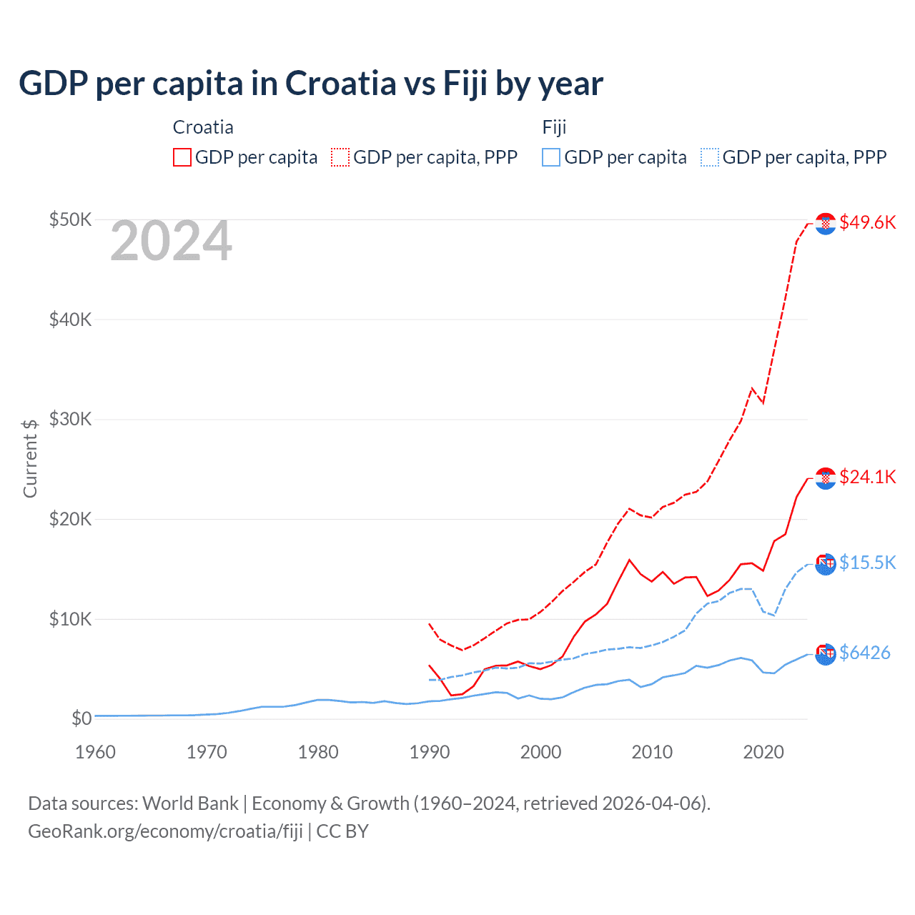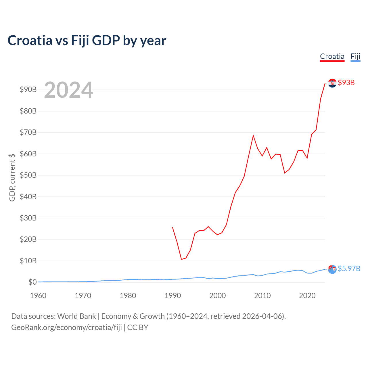 Croatia has a GDP of $93B compared to $5.97B for Fiji, ranking 75/197 and 161/197 by economy size, respectively.
