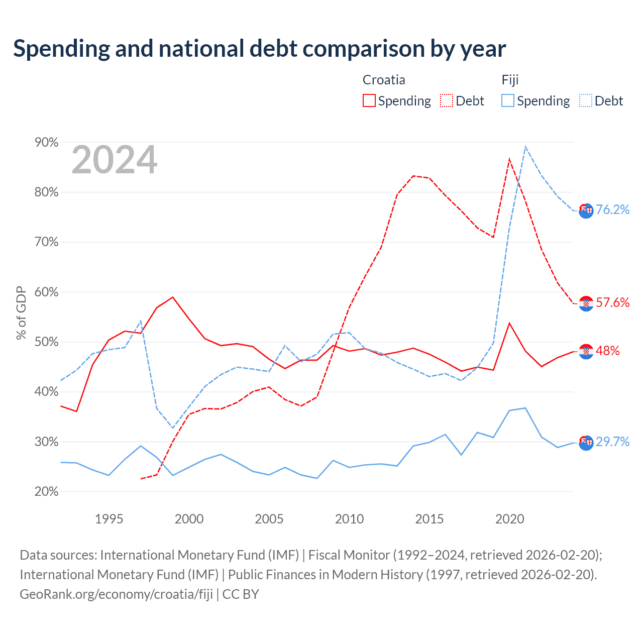 Croatia has $53.5B in government debt (57.6% of GDP), compared to $4.54B (76.2% of GDP) in Fiji.