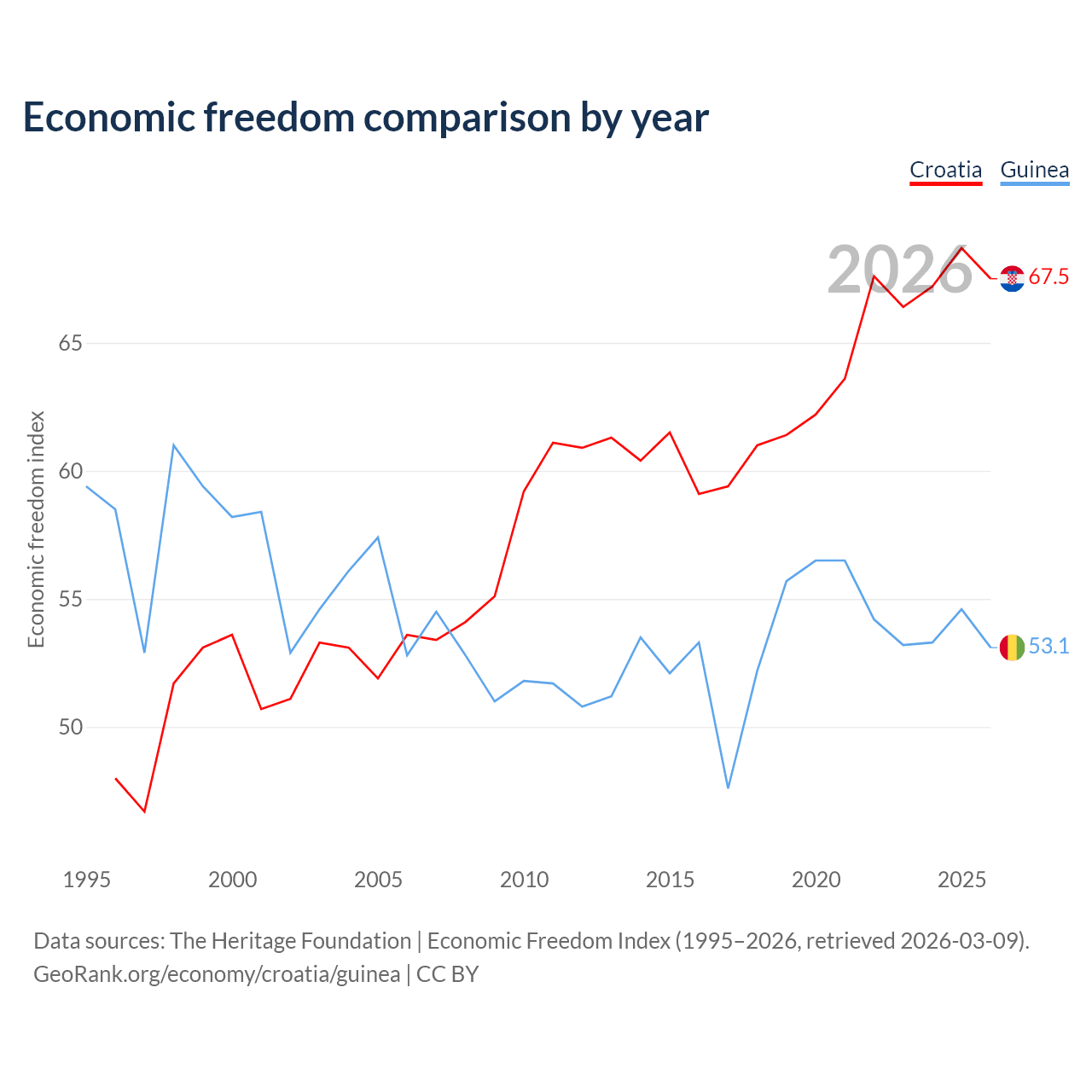 The Economic Freedom Index for Croatia is 67.5, ranking 56/197, compared to 53.1 for Guinea, ranking 141/197. The chart above displays a comparison of annual changes in economic freedom indexes.