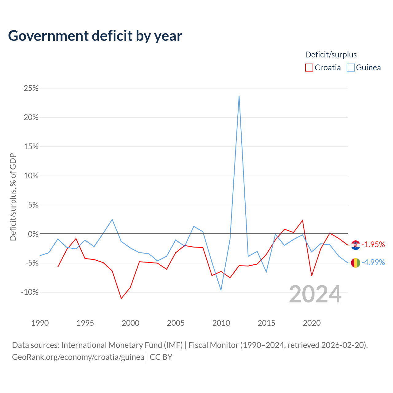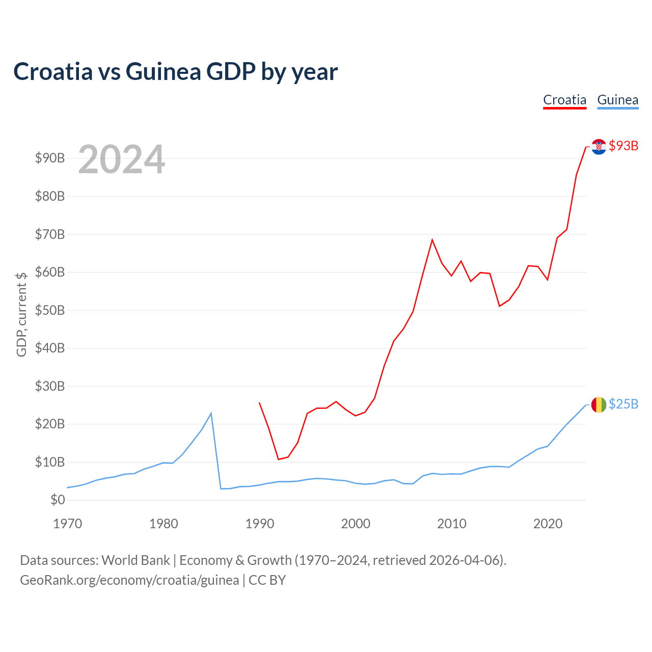 Croatia has a GDP of $93B compared to $25B for Guinea, ranking 75/197 and 118/197 by economy size, respectively.