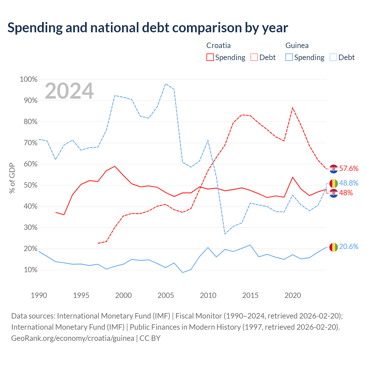 Croatia has $53.5B in government debt (57.6% of GDP), compared to $12.2B (48.8% of GDP) in Guinea.