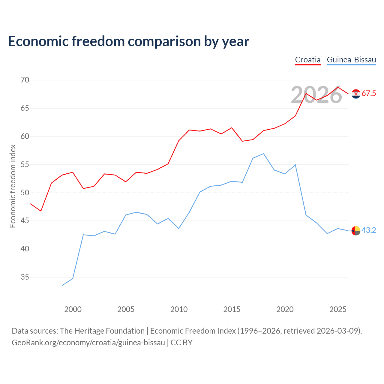 The Economic Freedom Index for Croatia is 67.5, ranking 56/197, compared to 43.2 for Guinea-Bissau, ranking 181/197. The chart above displays a comparison of annual changes in economic freedom indexes.