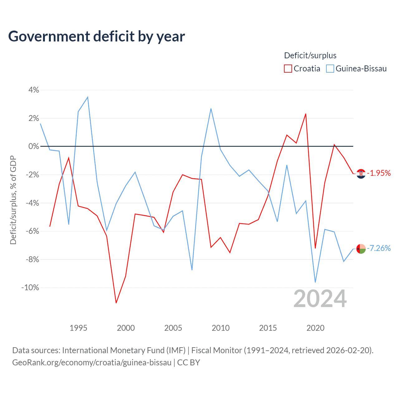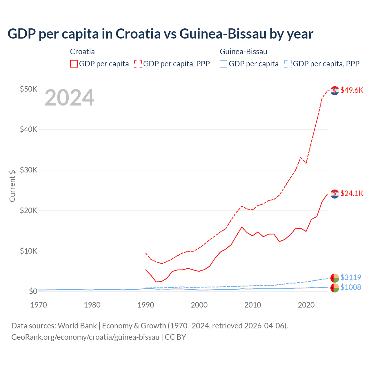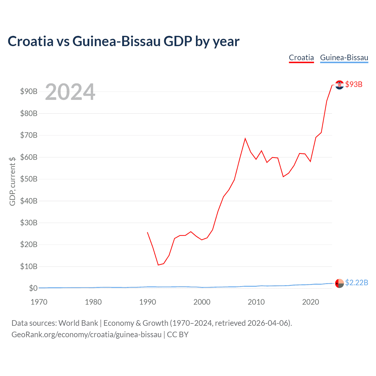 Croatia has a GDP of $93B compared to $2.22B for Guinea-Bissau, ranking 75/197 and 176/197 by economy size, respectively.