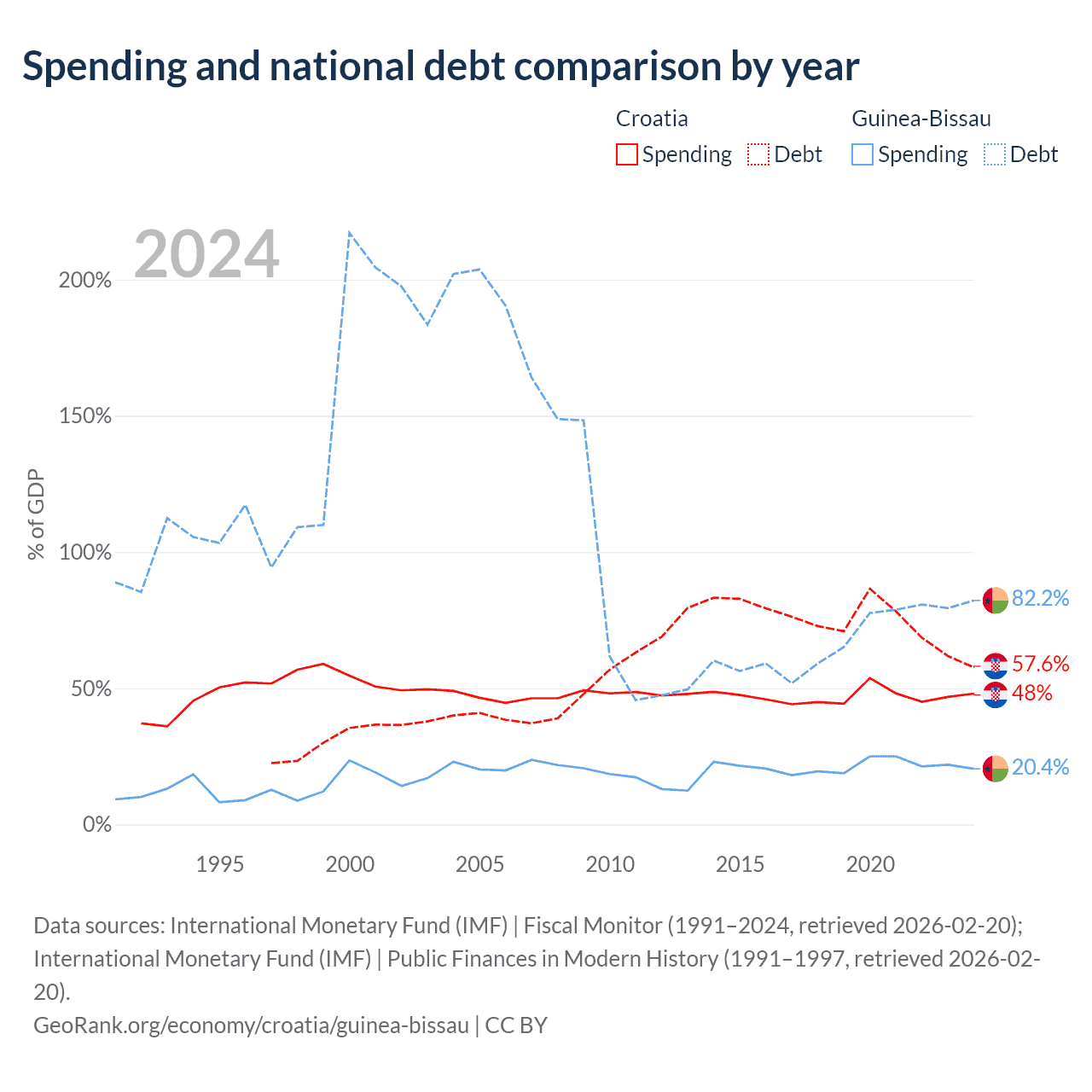 Croatia has $53.5B in government debt (57.6% of GDP), compared to $1.82B (82.2% of GDP) in Guinea-Bissau.