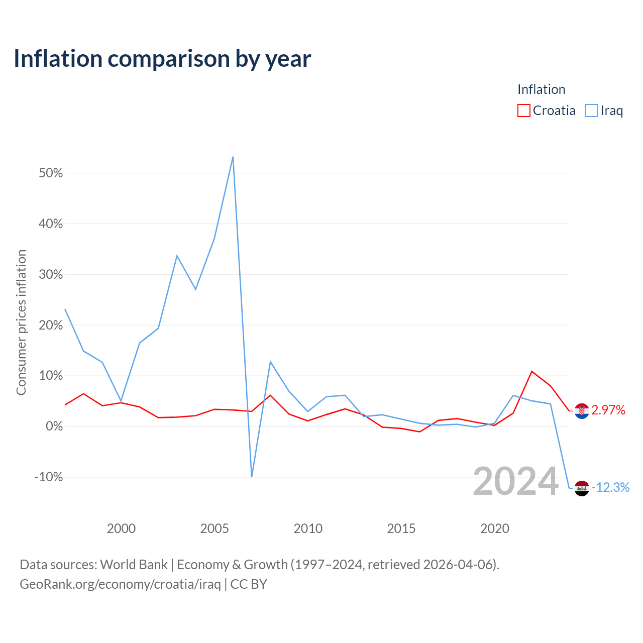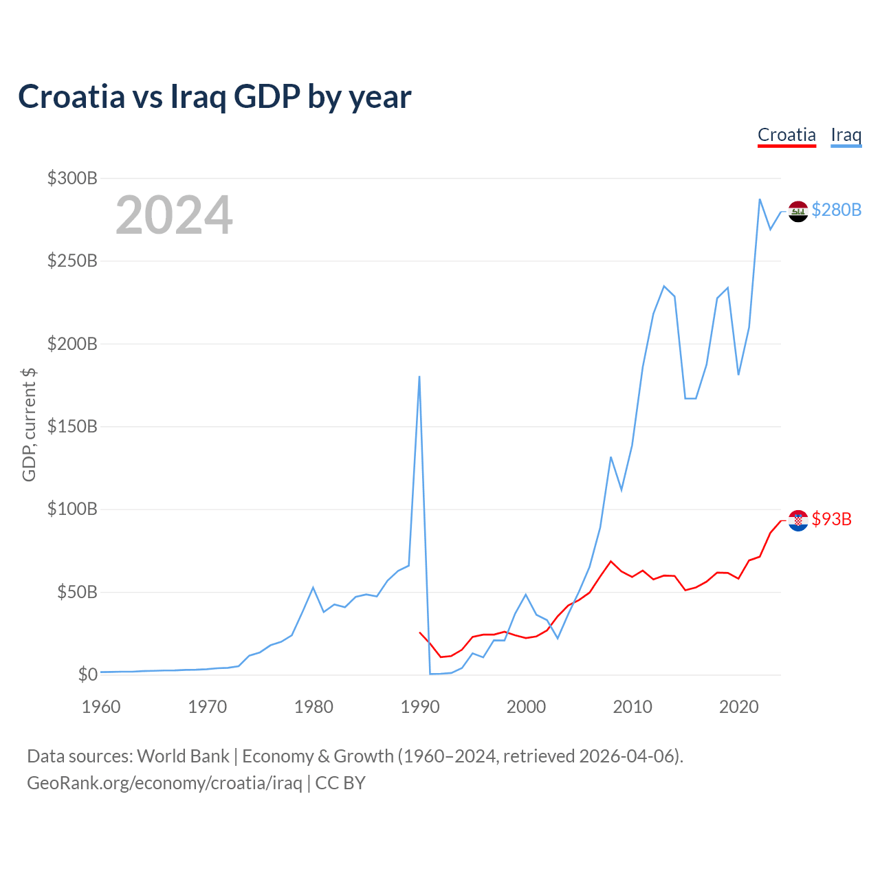 Croatia has a GDP of $93B compared to $280B for Iraq, ranking 75/197 and 50/197 by economy size, respectively.