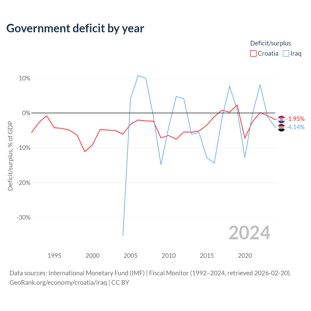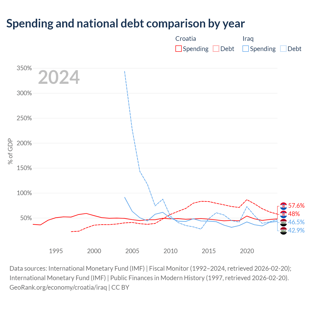 Croatia has $53.5B in government debt (57.6% of GDP), compared to $130B (46.5% of GDP) in Iraq.