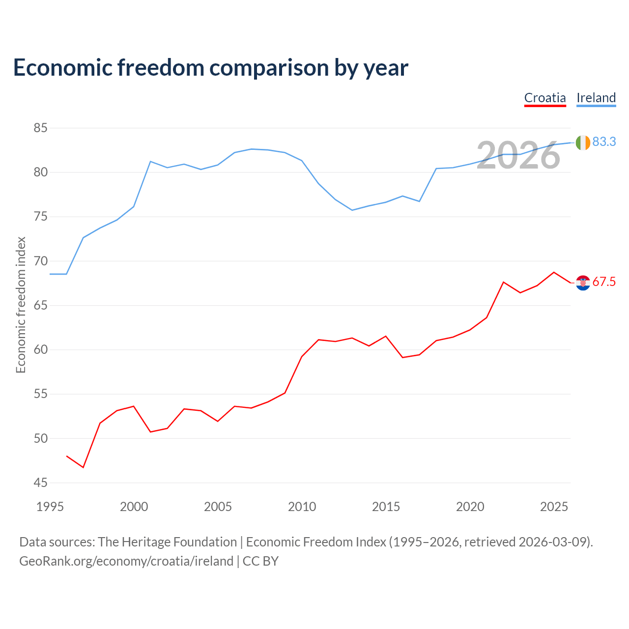 The Economic Freedom Index for Croatia is 67.5, ranking 56/197, compared to 83.3 for Ireland, ranking 3/197. The chart above displays a comparison of annual changes in economic freedom indexes.