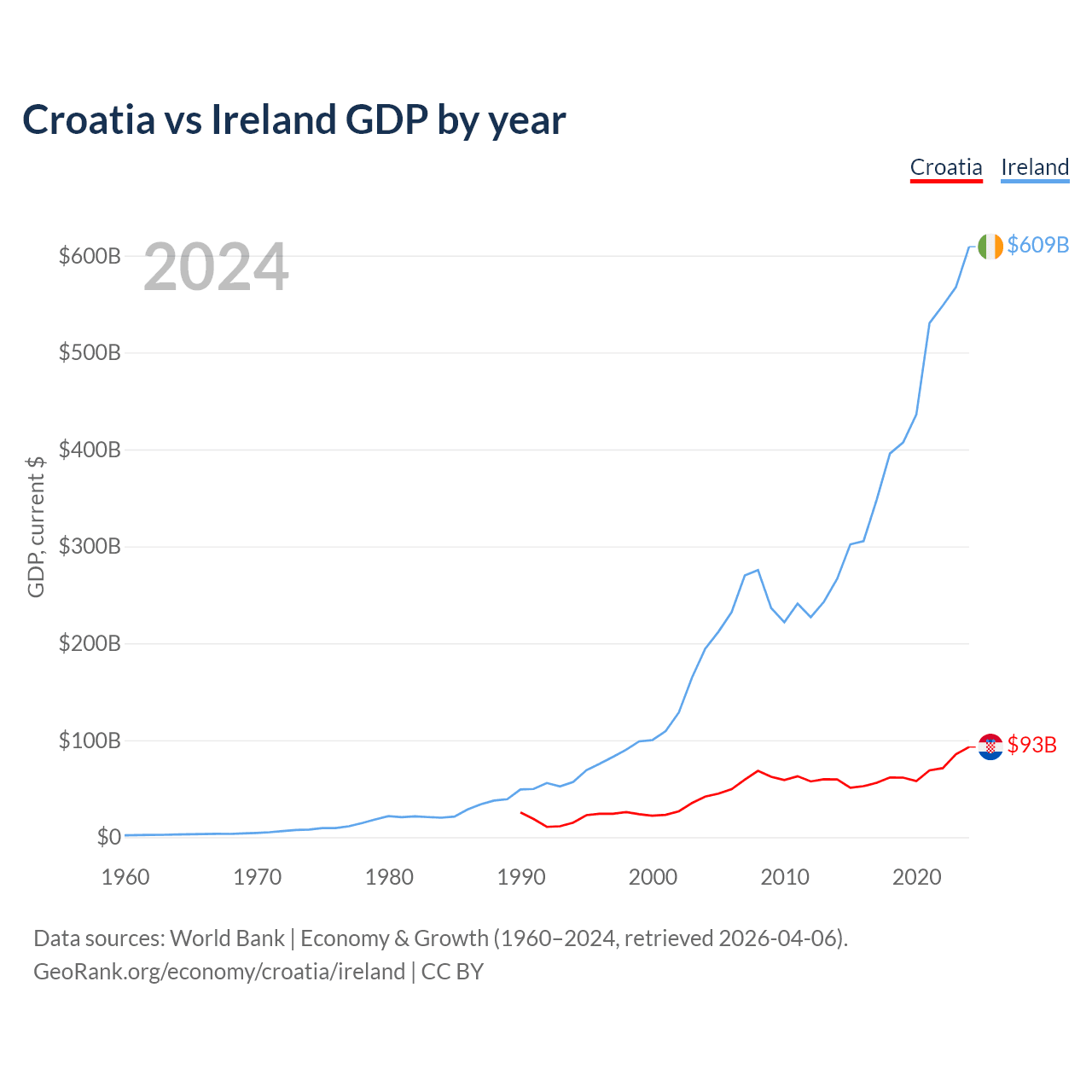 Croatia vs Ireland GDP by year