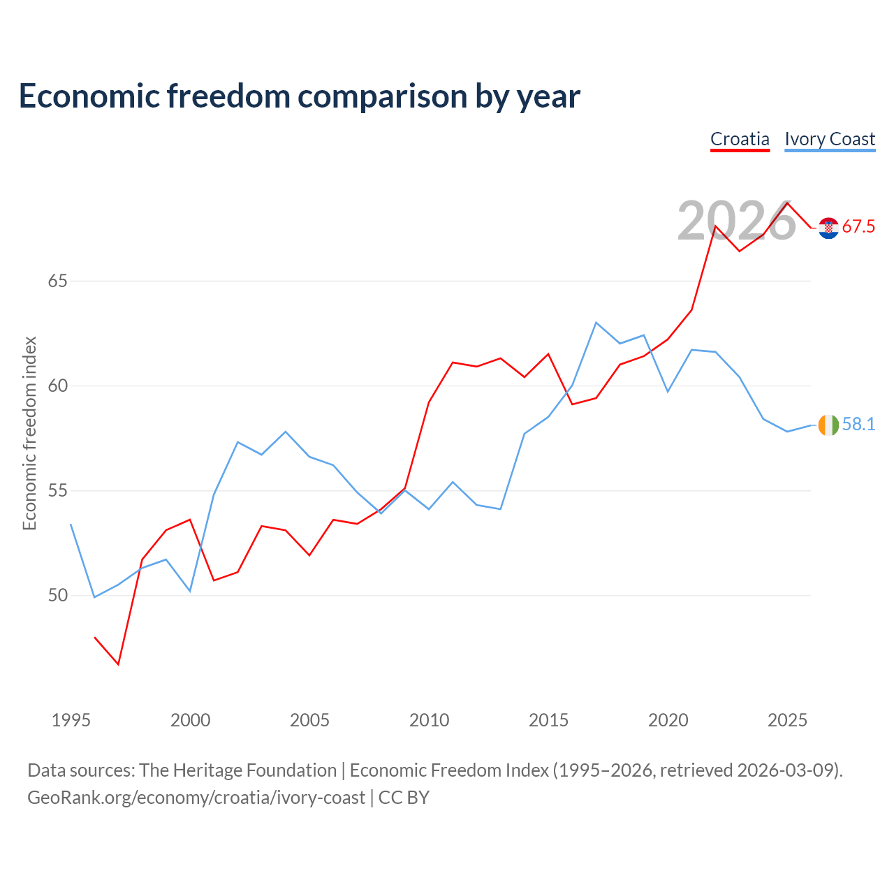 The Economic Freedom Index for Croatia is 67.5, ranking 56/197, compared to 58.1 for Ivory Coast, ranking 111/197. The chart above displays a comparison of annual changes in economic freedom indexes.