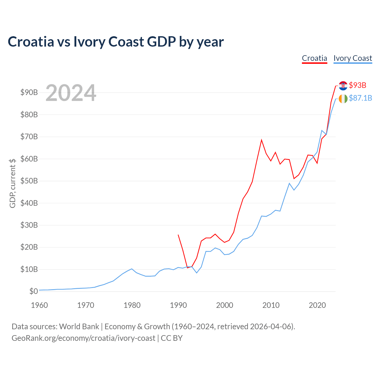 Croatia has a GDP of $93B compared to $87.1B for Ivory Coast, ranking 75/197 and 77/197 by economy size, respectively.