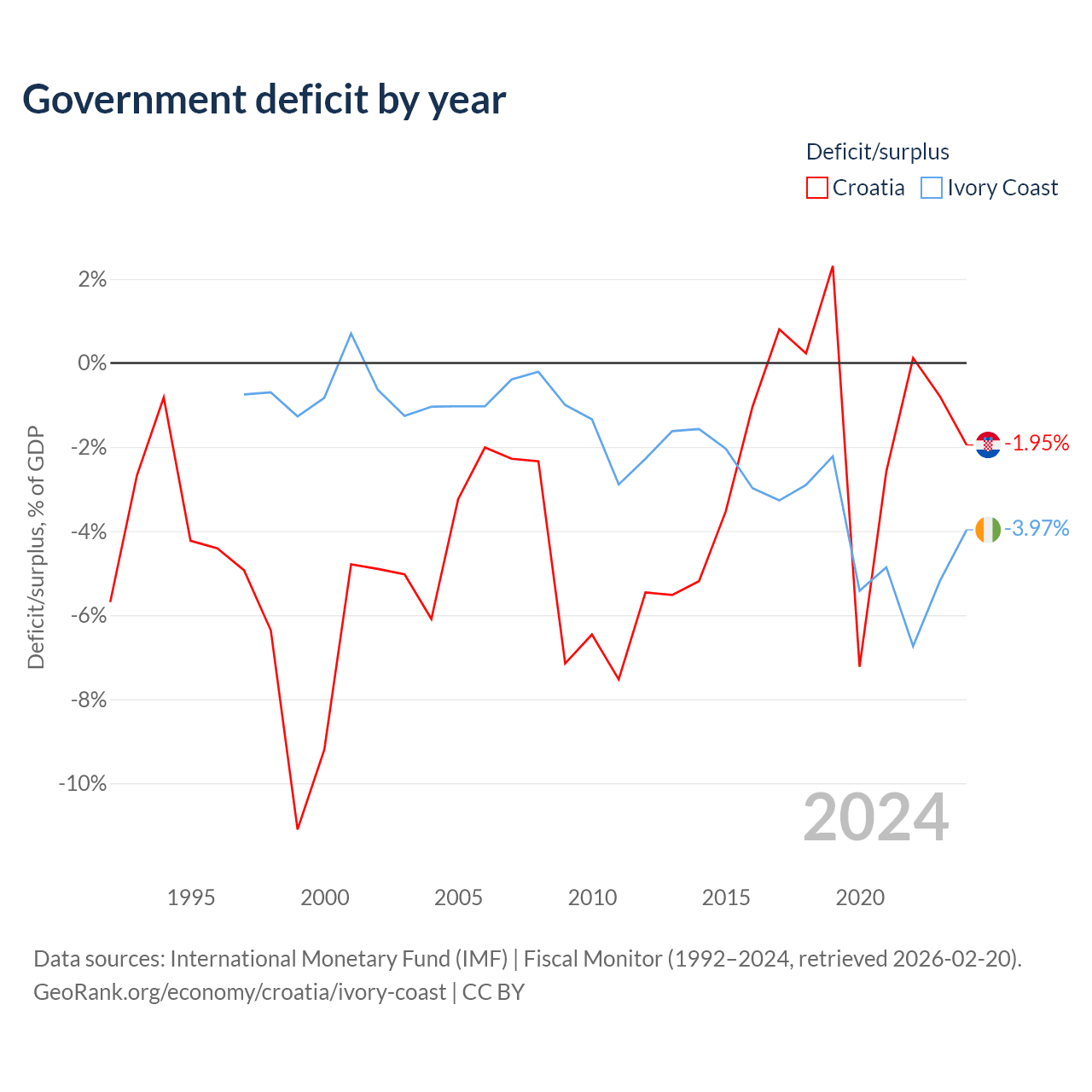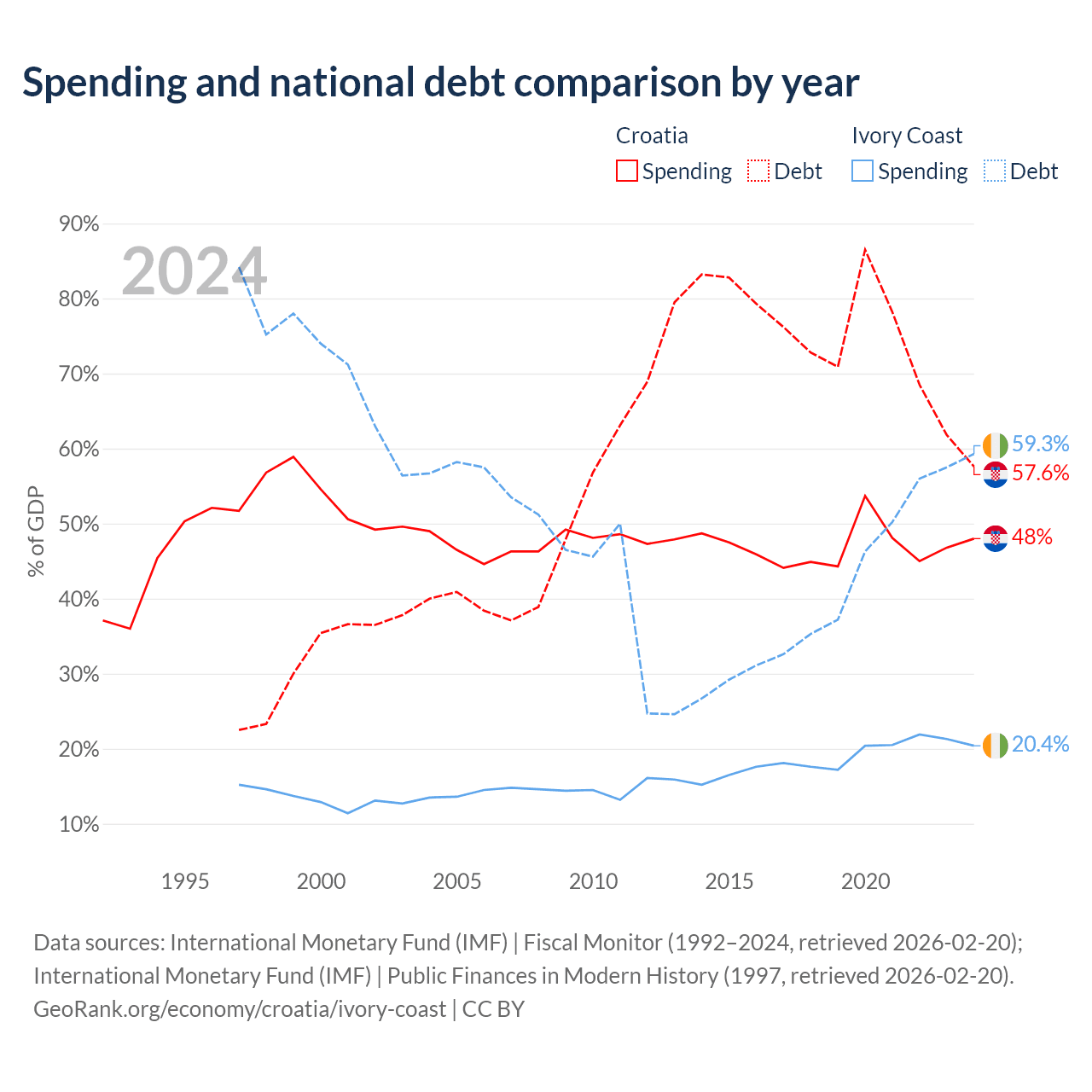 Croatia has $53.5B in government debt (57.6% of GDP), compared to $51.6B (59.3% of GDP) in Ivory Coast.